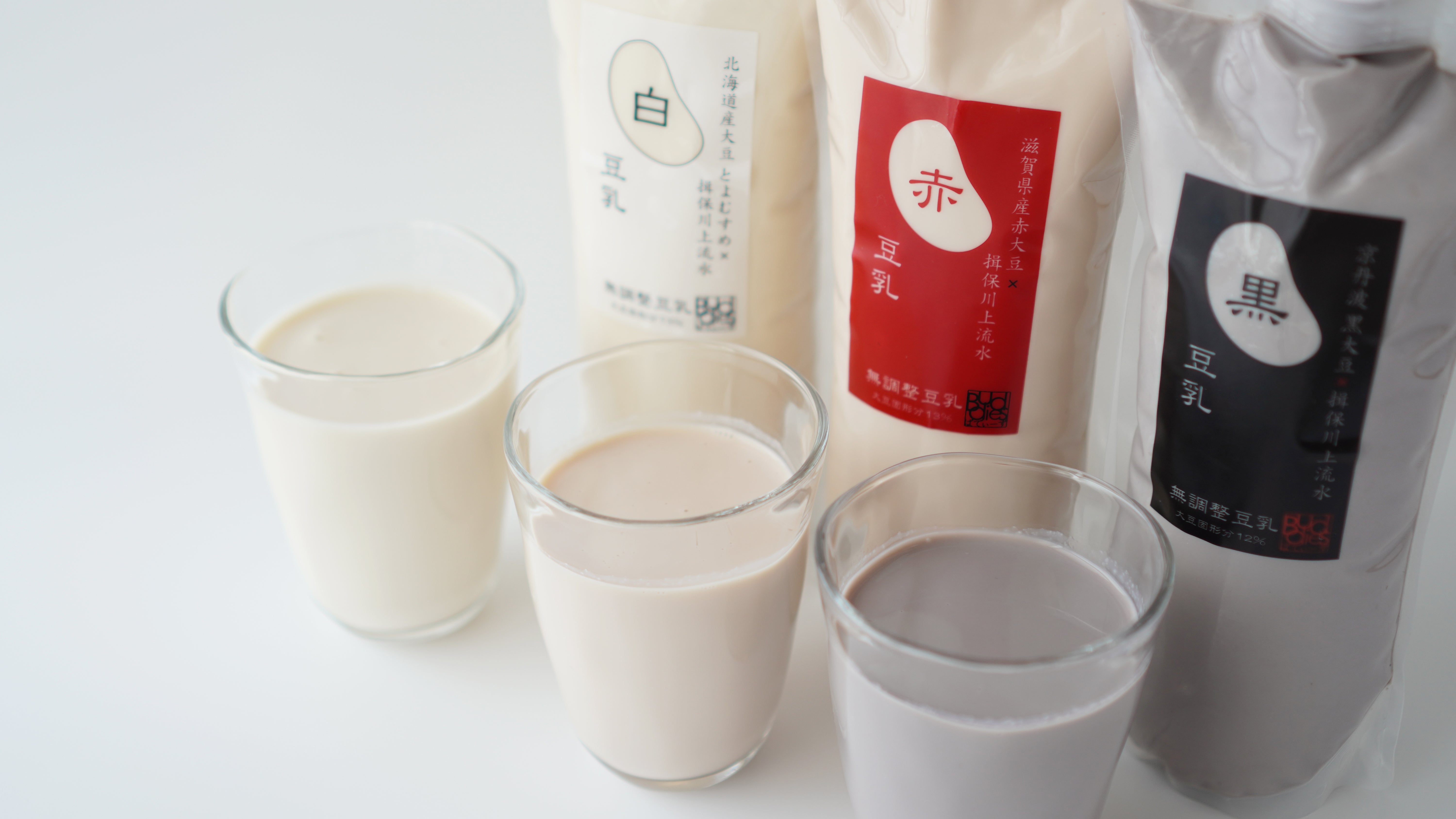 今回は「京丹波黒豆豆乳・滋賀県赤大豆豆乳・北海道とよむすめ白豆豆乳」の赤・白・黒の3色の無調整豆乳をセットにしてお届けします。