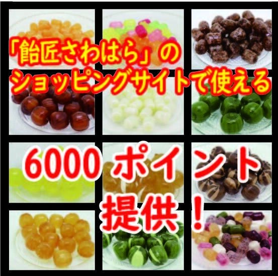 「飴匠さわはら」のショッピングサイト でお買い物ができるポイントを6000ポイント提供いたします。