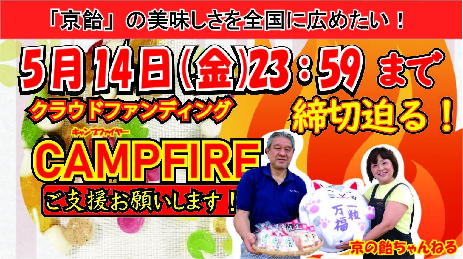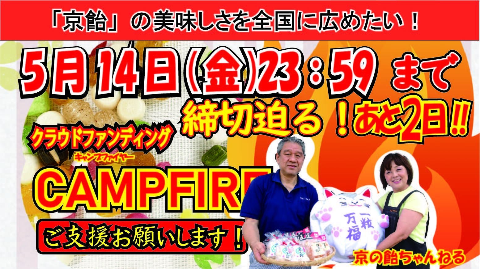 2021/05/12 11:38ご支援者の皆さまこの度は私たちのプロジェクトにご支援いただき、ありがとうございます。プロジェクト終了まであと2日となってまいりました。皆さまの温かいご支援に感謝申し上げます。現在のところCAMPFIREでの目標金額達成には残念ながら至っていないためプロジェクトのシェア等、支援者様のさらなるご協力をしていただけますと幸いです。こちらのリンクをシェアいただければと思います。https://camp-fire.jp/projects/view/407643なにとぞ、これからもご支援いただきますようお願い申し上げます。「飴匠さわはら」のホームページでは期間限定で下記の商品が発売中です!!宜しければ、弊社ホームページもご覧くださいね!https://www.kyoame.co.jp/shop/products/detail.php?product_id=174【今だけ20%off】京都の和飴詰合せ 230g 通常価格540円→432円 もっと見る