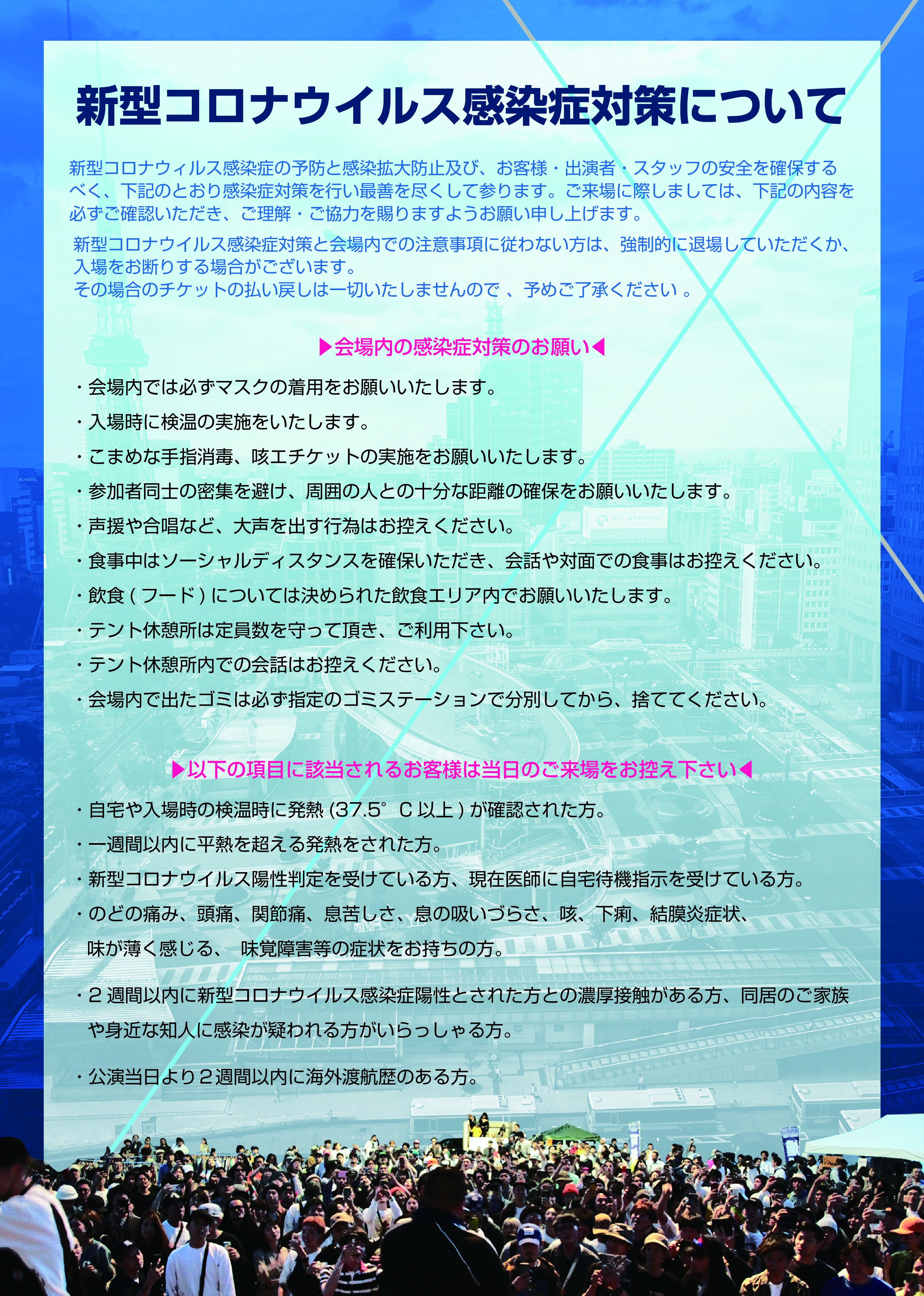 新型コロナウイルス感染症対策を行い感染拡大予防に最善を尽くして参ります。ご来場の際は内容を必ず確認して頂き、ご理解、ご協力をお願い致します。一人一人がルール、マナーを守り皆様が安心して楽しんで頂けるようなイベントを開催したいと思っております。