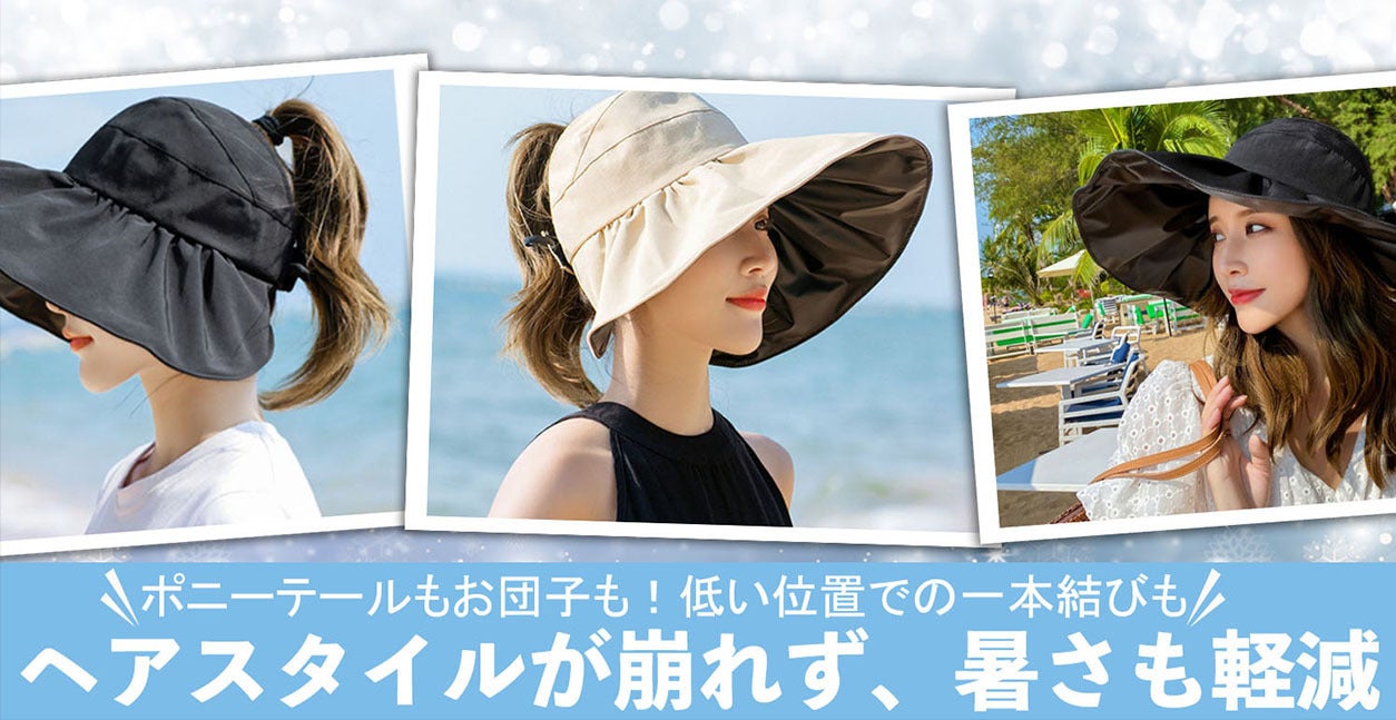 ヘアアレンジはもちろんヘアスタイルの崩れもおさえられ、蒸れも軽減します。高い位置でのお団子やポニーテール、低い位置での一本結びもゴムが邪魔にならず快適です。帽子をかぶる事で諦めていた髪型も「日傘みたいなつば広ハット」なら気にすることなくお洒落できます。
