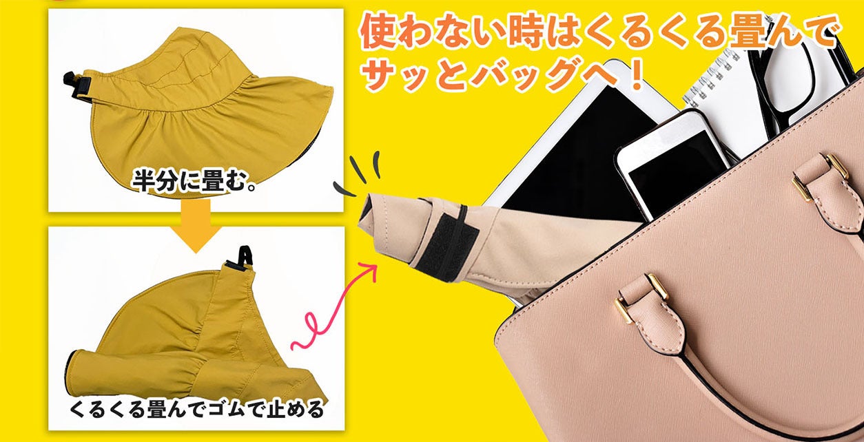 クルクルっと巻いて専用のゴムで止めて小さく畳むだけ!バッグの中で広がったりしません。