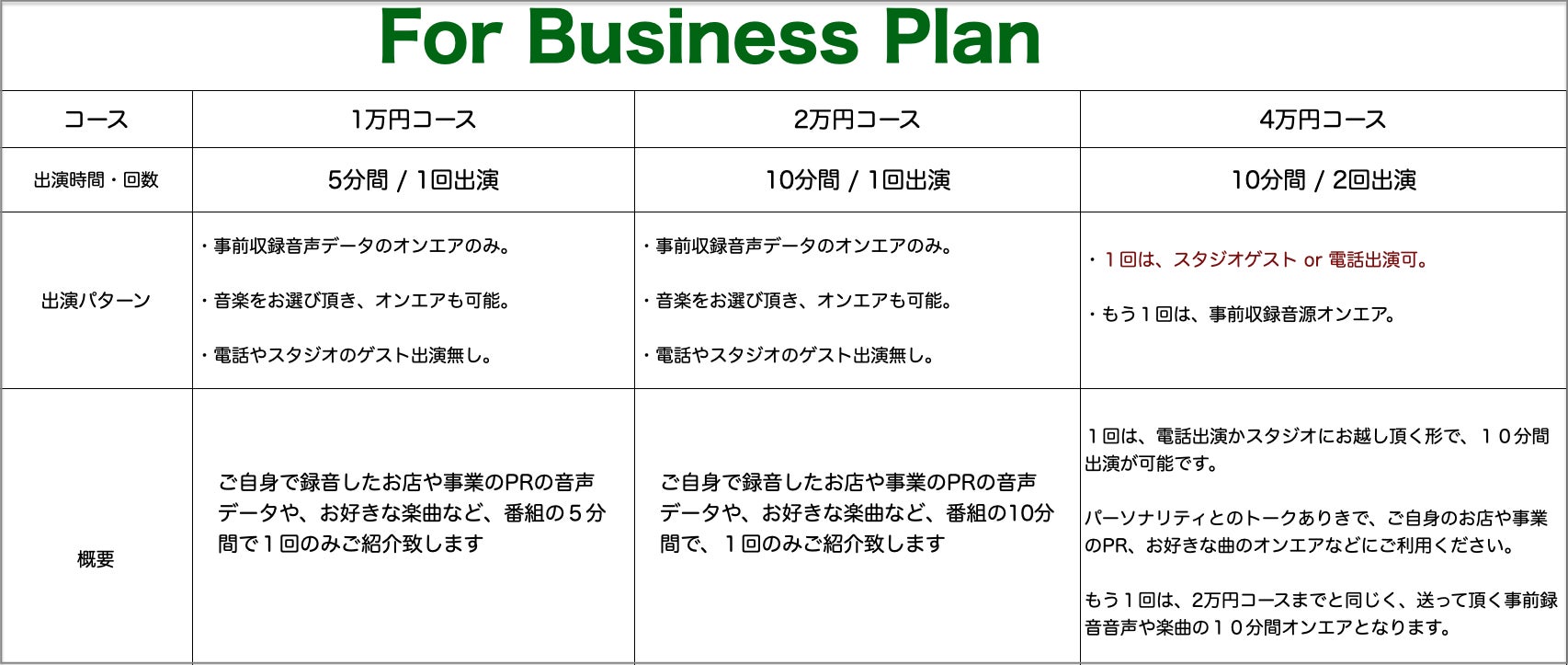 事前にご自身で録音したPRの音声データを、番組内の5分間で1回のみ、ご紹介・オンエア致します。お店や事業の告知をしたり、好きな楽曲を流すなど、ご自由なスタイルでPRなさってください。スタジオゲスト出演や電話出演はございません。放送日の指定は出来ません。出演をされる方は、コロナ禍で影響を受けている飲食業を始めとする事業者ご本人になります。■2万円コース / 10分間 (1回のみ出演)