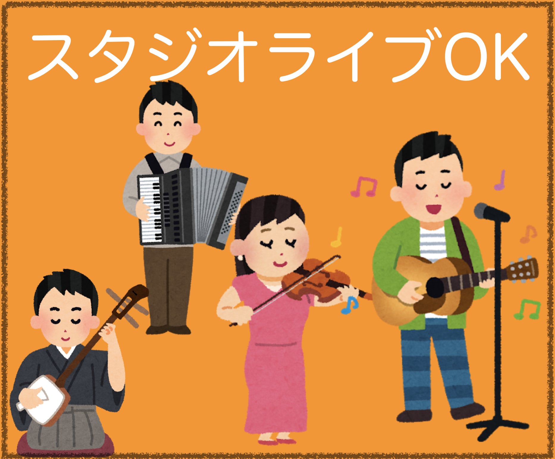 生演奏については、歌唱OK・弦楽器・管楽器・リズム楽器の演奏OKです。3人程度の演奏を想定してます。ご希望の方は事前にお問い合わせください。