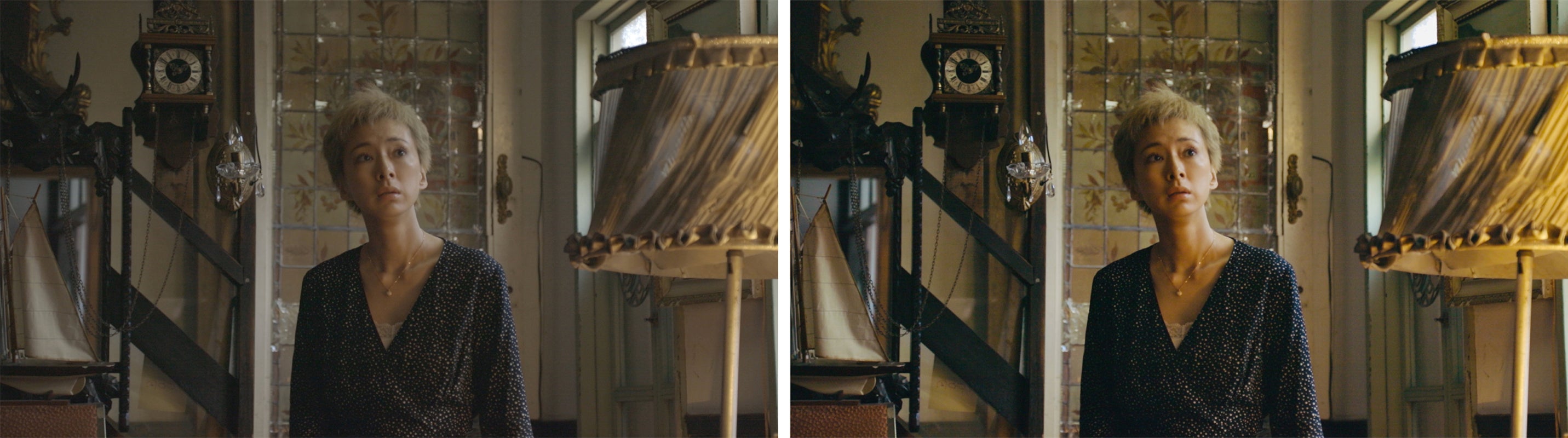 カラーグレーデイング前(左)と後(右)左の平板な画面が一変。演出の意図通り、夕方の最後の陽光が店内に差し込む静謐なひと時を醸し出せました。