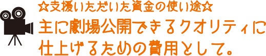 支援いただいた資金は、主に劇場公開に向けた最終仕上げのための「ポストプロダクション」を中心とした費用に使わせていただきます。
