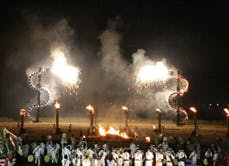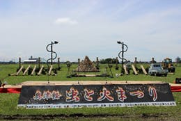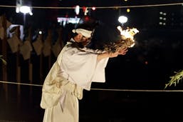 毎年6月第3土曜日、五所川原市「立佞武多の館」前から「虫」「お囃子」「松明」の運行を行い、岩木川河川敷へと練り歩きます。岩木川河川敷では、五所川原市にある神明宮宮司さんが、地域住民を代表し、地域の幸せとして「天下泰平」「国家安泰」「五穀豊穣」「悪疫退散」を祈願します。その後、まつりはフィナーレを迎え、全長21mの2つの大虫に、大虫昇天と称し花火開始と同時に点火し、ヤッサーの掛け声とお囃子、盛大な花火とともに燃え盛り昇天する大虫は圧巻です。
