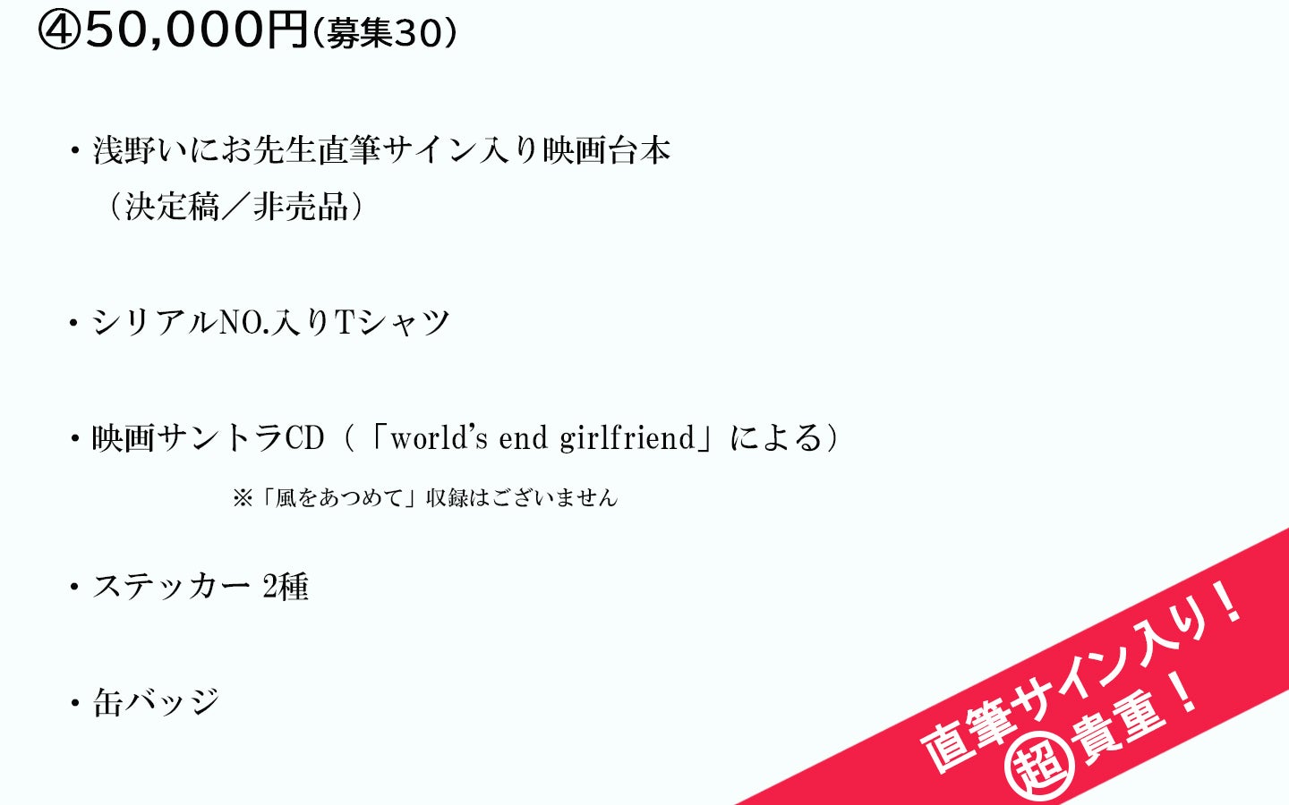 2021/05/22 13:08③(15000円コース)と④(50000円コース)につきます【映画サントラCD (「 world‘s end girlfriend」による)】は、world‘s end girlfriendさんのツイートにて告知ございましたが、world‘s end girlfriendさんの所属レーベルであるvirgin-babylon-recordsより映画公開日(8月20日)にサントラが発売されることになり、それと同じ商品となります。(詳細は未定)今回の【浅野いにお「うみべの女の子」実写映画化記念グッズプロジェクト】で該当コース(③と④)をお申込みの方には、ご希望の方へ特別にサントラCDへworld‘s end girlfriendさんのサインを書いていただけることになりました。ご希望の方は、備考欄に「CDサイン希望」とお手数ですがご記載ください。※既にお申込みの方も備考欄変更可能です。どうぞよろしくお願いいたします。 もっと見る目標金額に到達しました!(御礼)