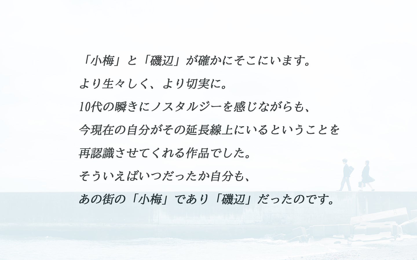 2021/04/30 17:04本日、皆様のご支援のおかげで、目標金額に到達しました!本当にありがとうございますm(__)mグッズを製作することができ、皆様にそれぞれお申込みいただいたグッズをお届けできることを嬉しく思います!また、ご支援いただいた皆様の応援コメント、本当にありがとうございます。浅野いにお先生、原作「うみべの女の子」のファンの方々、石川瑠華さん、青木柚さんはじめキャストのファンの方々、world's end girlfriendさんのファンの方々、それぞれの想いをいただき、我々が愛するもののファンの皆様のことを、勝手に同志だと感じております。原作の連載では、第1巻の終わりの第10話と第2巻の始まりの第11話の間に東日本大震災が起こりました。その10年後の2021年。コロナ禍の中、映画が公開されます。二つの出来事はそれぞれ違いますが、非日常が日常になってしまう困難な状況であることは変わりないと思います。応援コメントの中で、「登場人物の同世代だけでなく大人こそ観るべき作品」と記載いただいておりました。コメントいただいた方の意に沿っているか分かりませんが、まさに原作は「少年少女のせつない恋愛」に留まらず、普遍的な何かを表現している傑作だと思っています。また普遍的なものが困難な時に寄り添ってくれるものだと信じております。映画製作は良くも悪くも非日常です。本作も多くの困難に合い、多くの奇跡に恵まれました。皆様にとっての特別な原作が、実写化され、皆様にとって特別な映画になることを信じ、また、多くの方へ本作を届けられるよう頑張っていきたいと思います。引き続きの応援のほどよろしくお願いいたします!本当にありがとうございました! もっと見るそれぞれのリターンについて