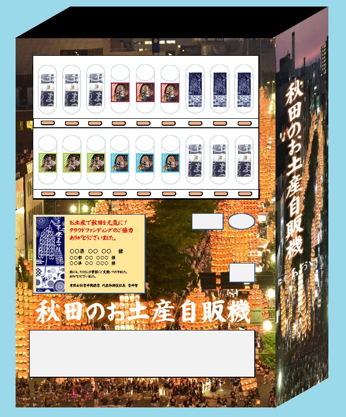 また、24時間、年中無休で非接触で販売できることで現在注目されている、「自動販売機」を導入することにより、感染対策を行いながらも、地元の人々や、秋田を訪れた皆様が、竿燈まつりのお土産品を手にしていただき、少しでもまつりのにぎやかさや、祭り人の想いを感じ取っていただけますと幸いです。