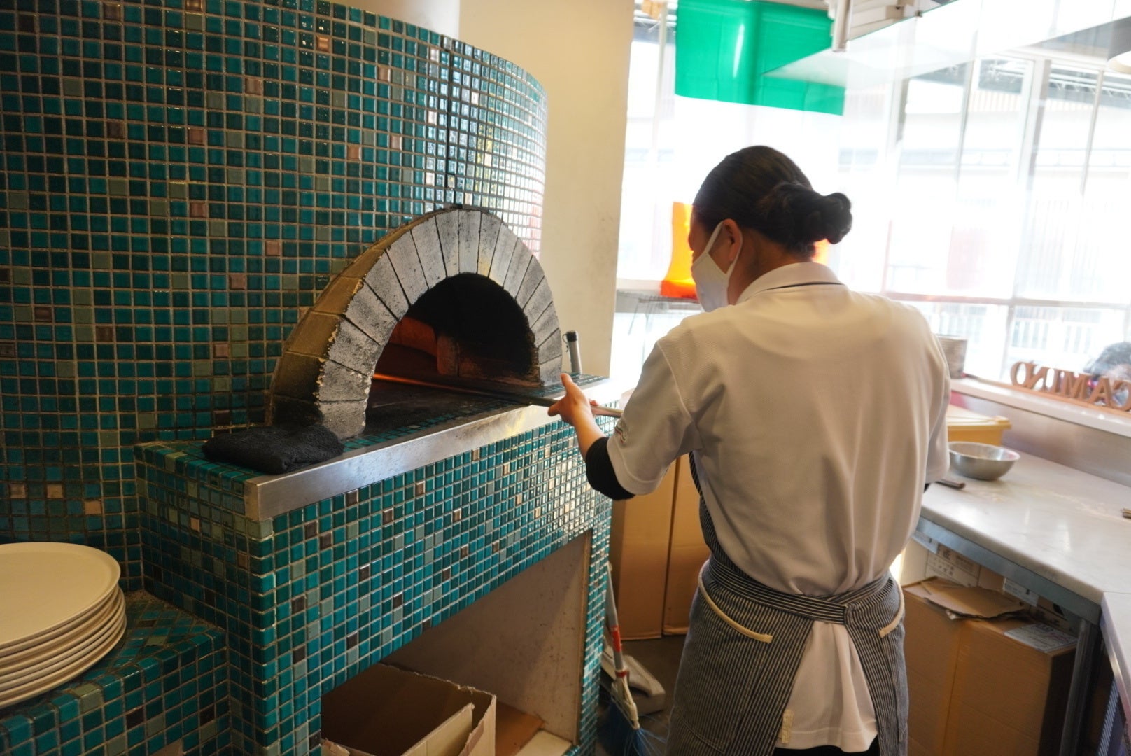 アルカミーノでは、高温の薪窯で1枚1枚丁寧に手で伸ばし焼いています。生地はイタリアの粉100%で毎朝お店で練り作っています。トマトソースやチーズ、ハム等イタリアの食材を沢山取り入れ、野菜は契約農家さんから仕入れ、有機野菜を中心に使い、こだわりの本格ピッツァに仕上げております。