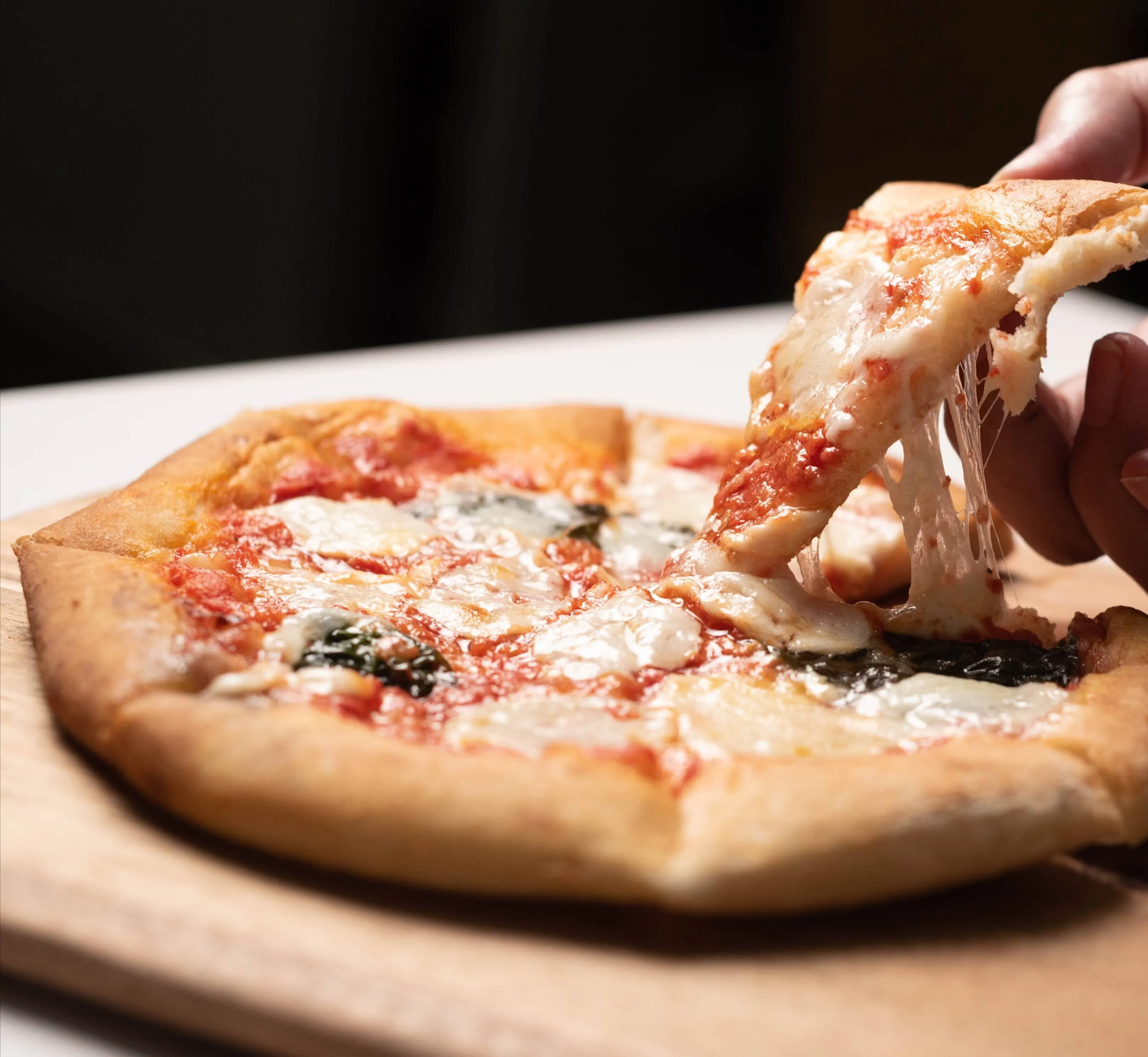 冷凍ピッツァはお店で提供しているものと同じように作っています。1枚1枚丁寧に焼き上げたピッツァを真空パックにし、冷凍しております。