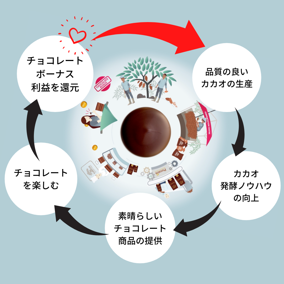 高品質なチョコレートをチョコレートを愛する多くの人へお届けすることで生まれる収益をカカオ生産者へ還元しています。現金による配布だけではなく、小学校や自家発電設備等が完備された産院の建設、ソーラーパネルを備えた飲料水浄水施設を新設やカカオ生産者子息への奨学金や学用品の授与など様々な形でカカオ農家やそのコミュニティに対して支援しています。