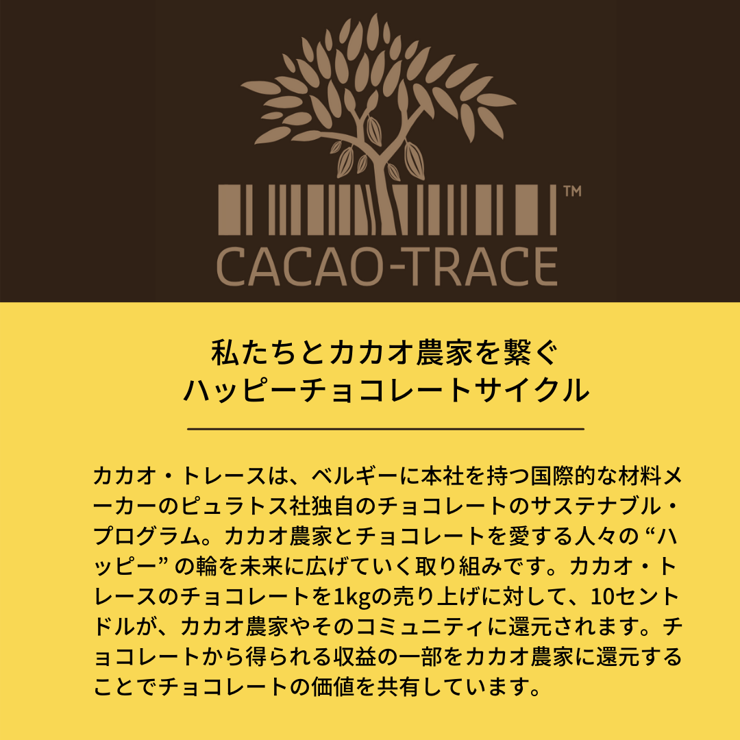 「カカオの発酵の専⾨家であるラファエル オードワン・ローゾーらがプログラムを構築し、独自の発酵および乾燥工程の一元管理をされています。農園の近くに設けられた管理施設では、カカオ発酵の専門家が発酵のプロセスをモニターし、日々改善を行っています。これにより上質な味わいのチョコレートが作られています。カカオ・トレースのチョコレートは、良質なカカオを厳しいガイドラインに沿って発酵、乾燥して作られています。
