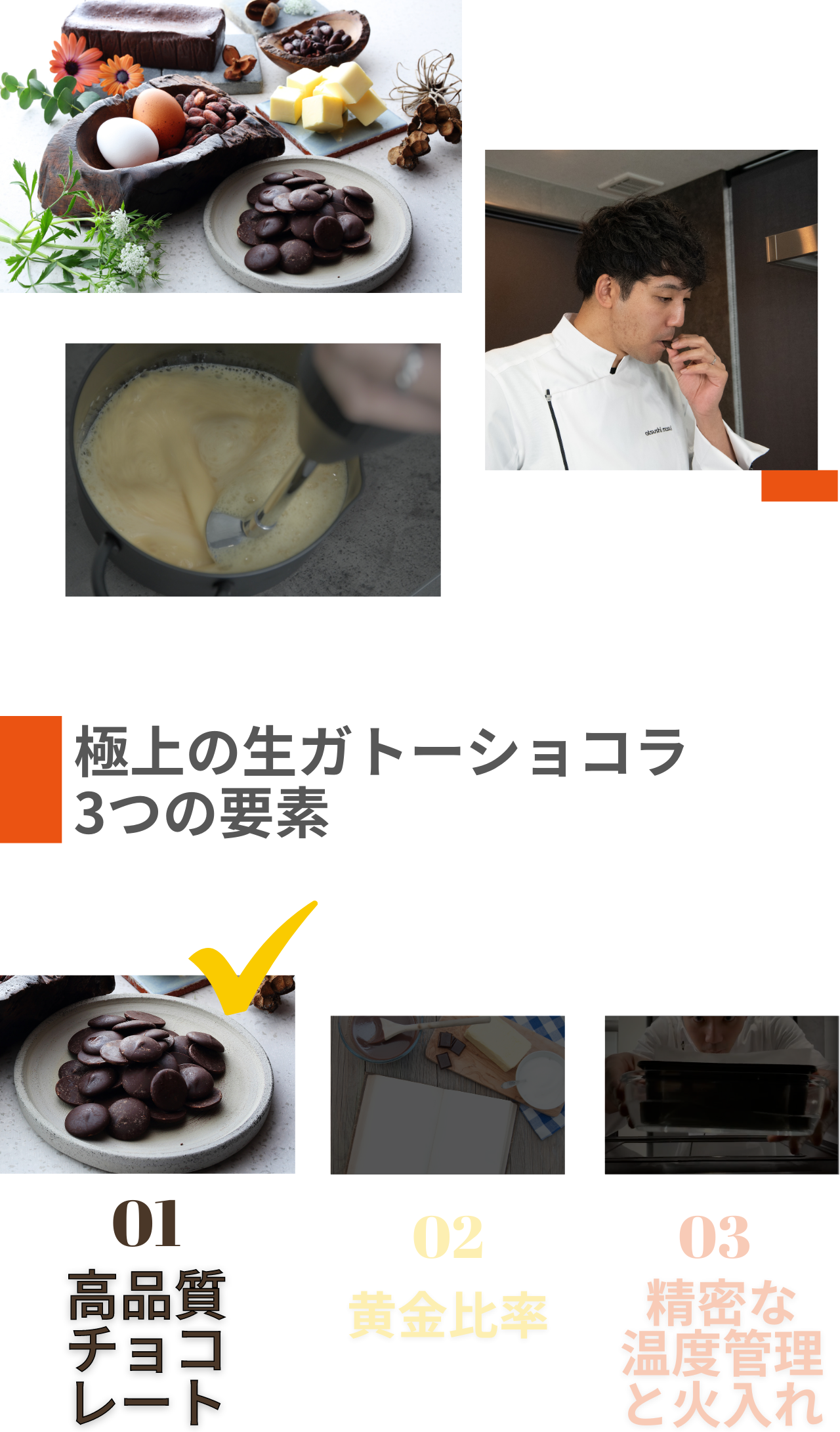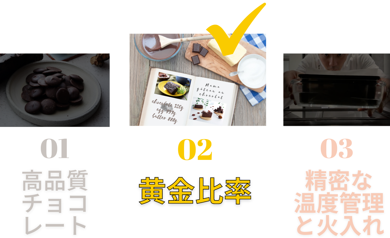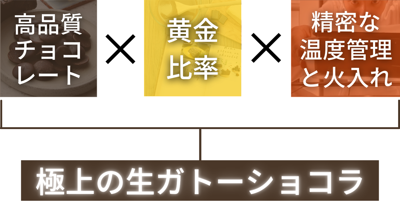 黄金比率を見出す。風味やコク、美味しさを極限まで高めるために配合比率を研究し尽くしました。先述のとおり配合比率がわずかに変わってしまうだけで、味のバランスが崩れてしまい極上の味わいを生み出すことはできません。このチョコレートのための黄金比率を見出すために何度も試行錯誤を重ねました。