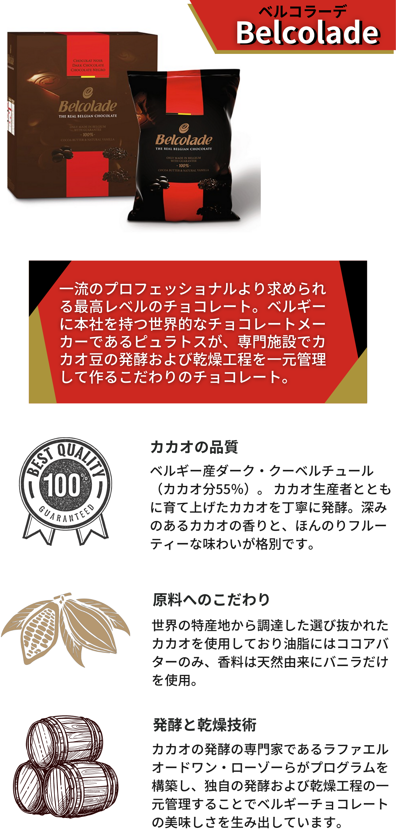 - 上記の2つの国際規格を満たした製菓用チョコレート。カカオ分が多いためカカオ本来の味を楽しむことができる。