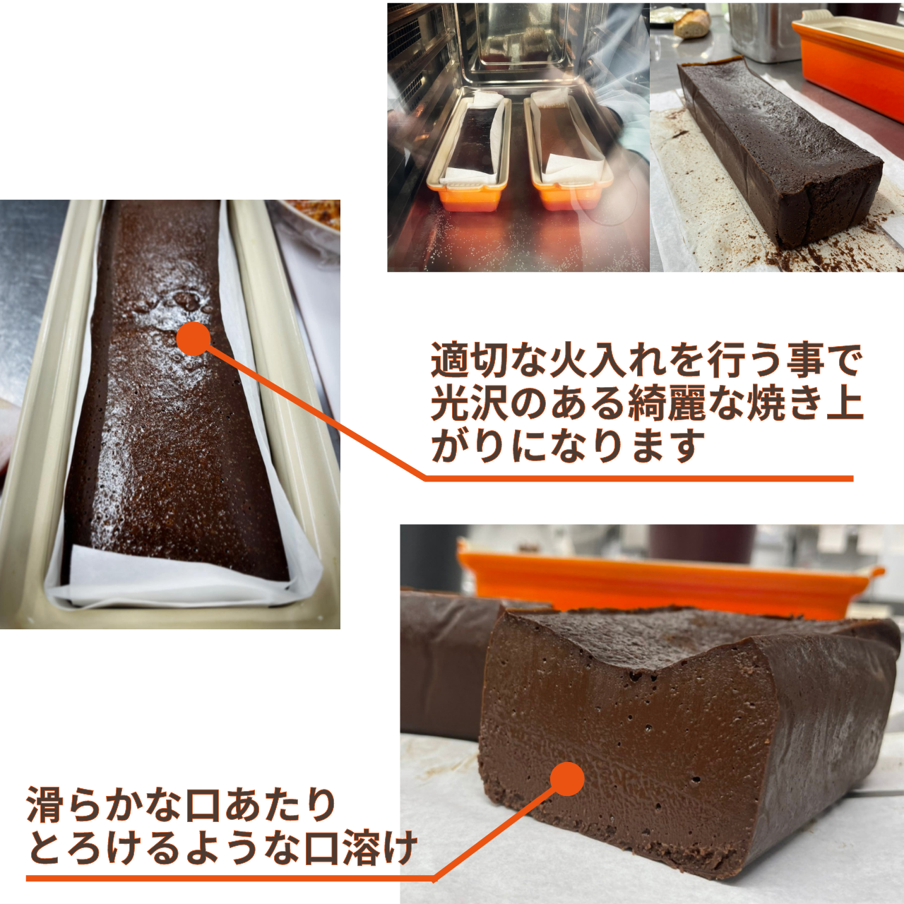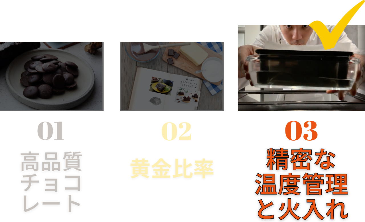 このガトーショコラは小麦粉を一切使用していないので、火の入れ方一つで味や食感・舌触りが大きく変わってきてしまいます。火が入りすぎてしまうと求める口溶けの良さが表現できないため、実は焼く工程は一番気をつけなくてはいけない作業です。このガトーショコラは分量の比率や気温や湿度の僅かな変化による調理方法の微調整、火の入れ方の技術的な要素も加わるため他とは違う唯一無二の生ガトーショコラに仕上がります。