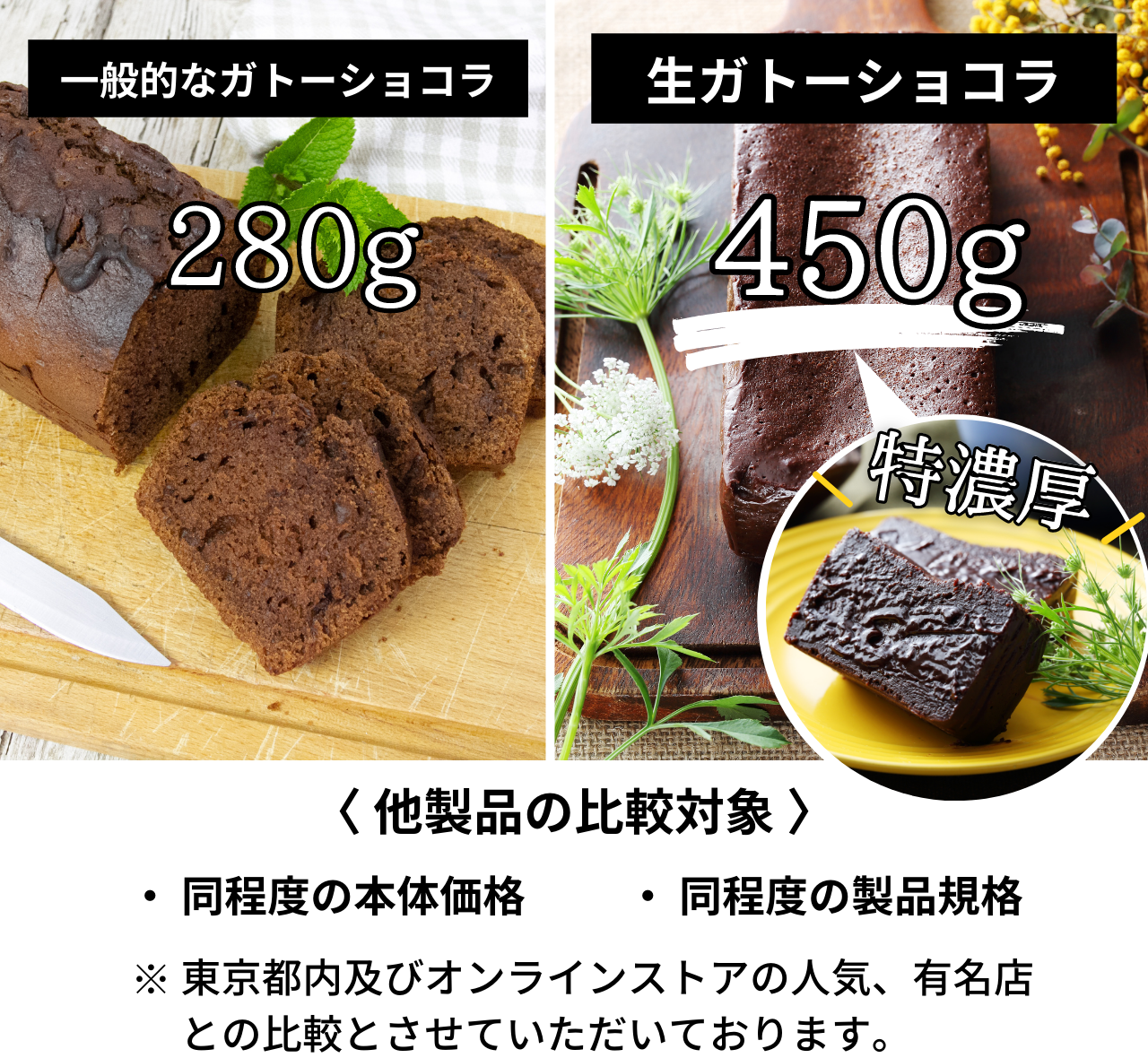 【特濃厚な幸せ】厳選したチョコレートと*バターをふんだんに使用しています。一般的な通常のガトーショコラは1本あたり280g前後の規格が多いのですが、この生ガトーショコラは450gもの重さ(約1.5倍)があります。この重さの差が高品質なチョコレートが凝縮されている証拠です。