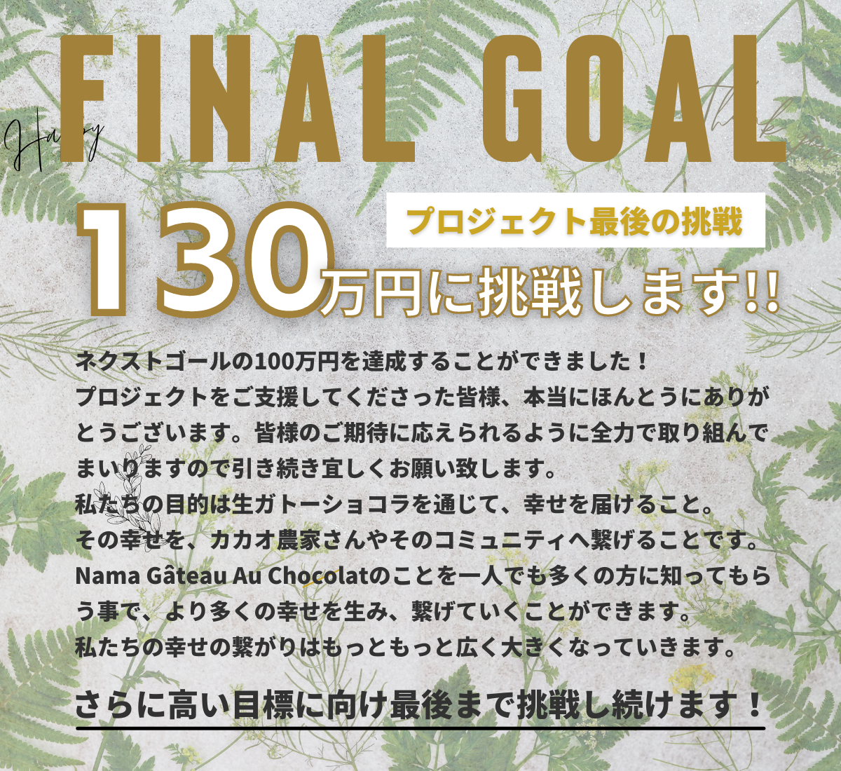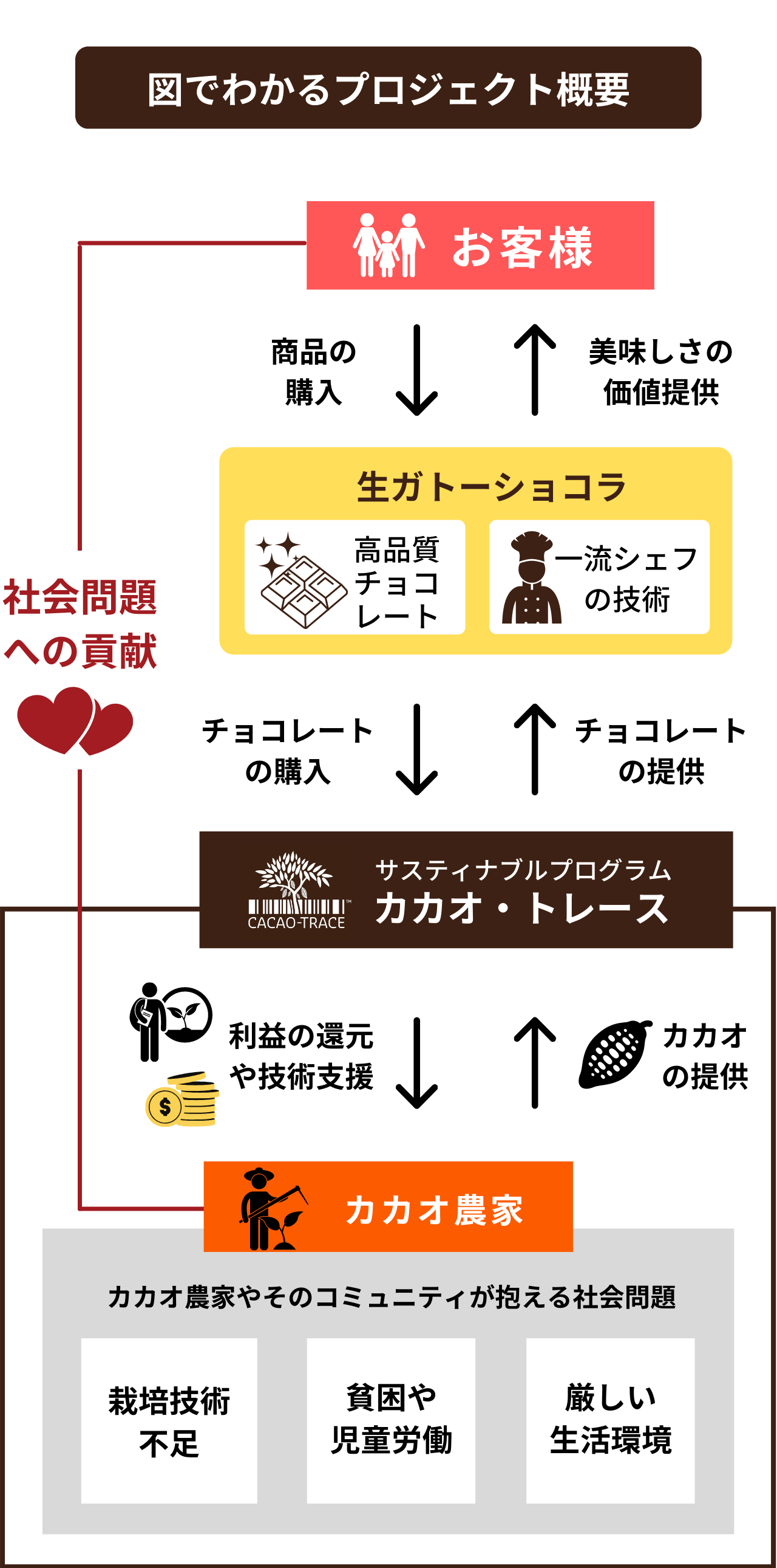 お客様がいてくれて、カカオ・トレースというサステナブルプログラムがあるからこそ、私たちはSDGsや社会問題に対して取り組むことができます。Nama Gateau Au Chocolat は「お客様」と「カカオ・トレース」と共に歩んでいきたいと思っています。