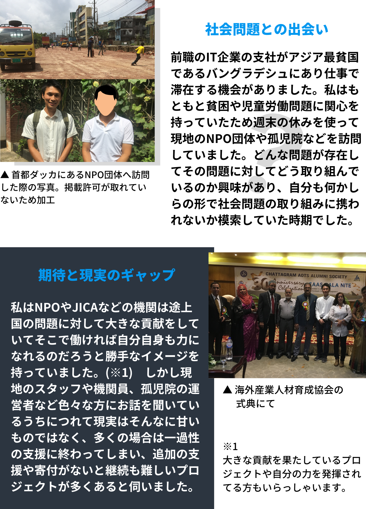 自動車販売会社で営業とマーケティング担当として勤めた後、IT業界のスタートアップ企業で新規事業の立ち上げに携わる。同社のバングラデシュ支社で勤務した際に途上国問題などに触れ、その経験からソーシャルビジネスで起業することを決意。経営を学ぶため自動車販売会社の創業に携わり経営戦略やマネジメントを経験した後、Nama Gateau Au Chocolatのプロジェクトに挑戦中。プロジェクト全体のディレクションとマーケティングを担当。