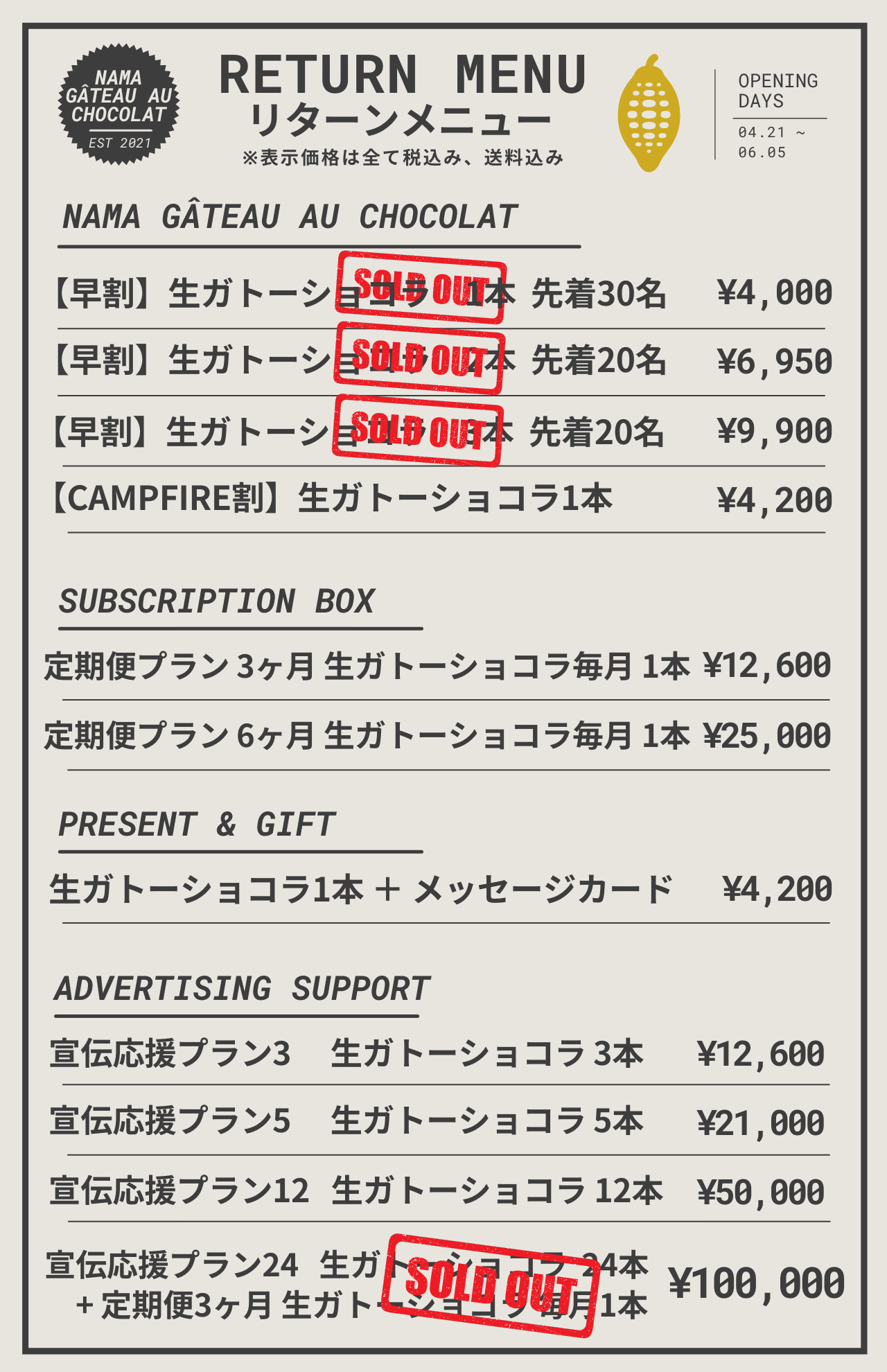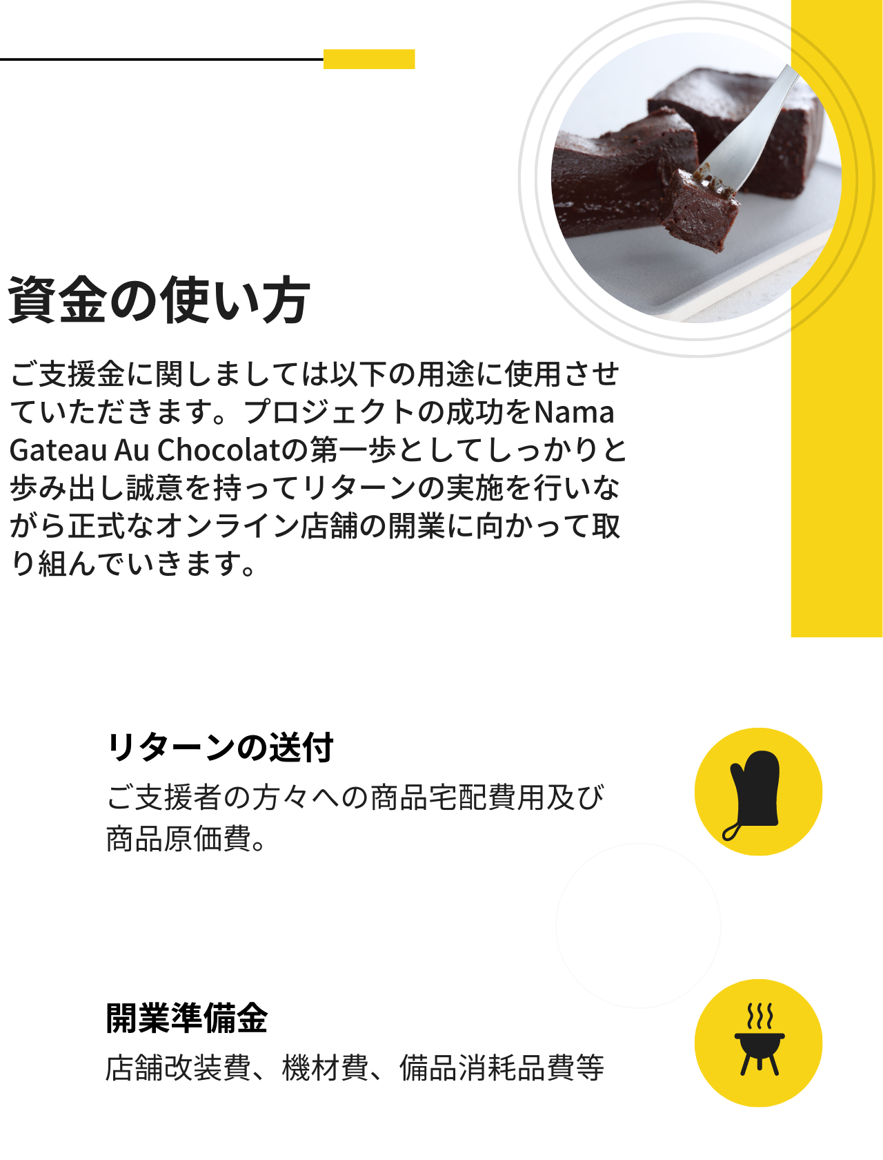 私たちのプロジェクトの目的は「幸せを届けて、その幸せを生産者さんへ繋げること」です。そのためリターンは全て生ガトーショコラをお届けする内容になっており、応援金をいただくだけのリターンや生ガトーショコラと関連がないリターンのご用意はしておりません。応援していただく場合もその金額に見合った分の生ガトーショコラをご提供させていただきます。1人でも多くの方へこの生ガトーショコラをお届けしたいと考えております。