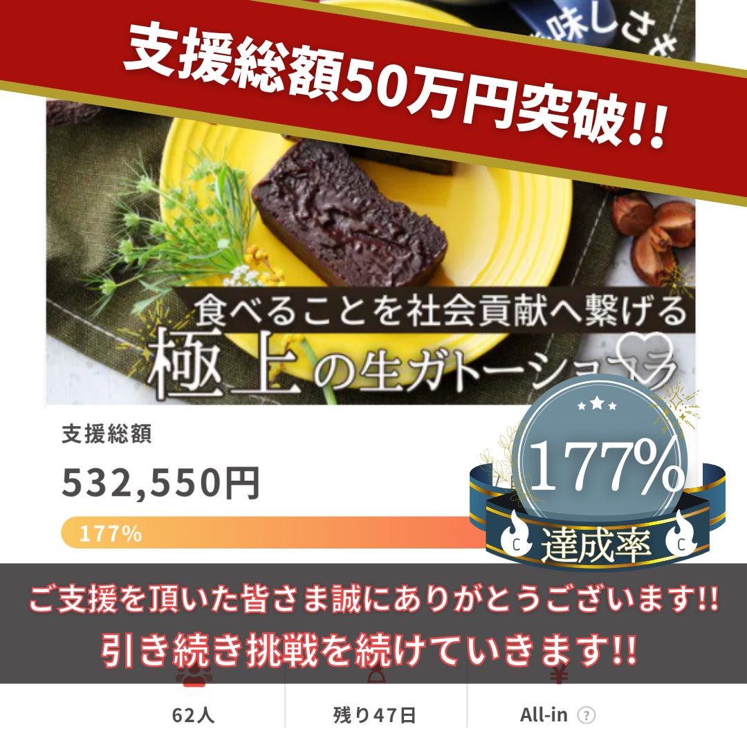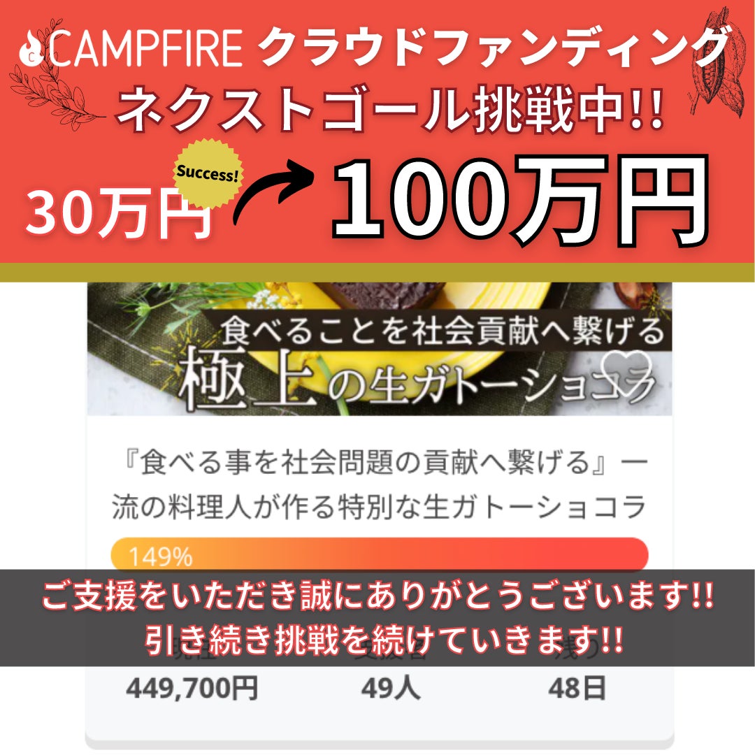 CAMPFIREと取り決めた目標金額は達成しましたが、1人でも多くの方に生ガトーショコラをお届けできるように引き続き挑戦を続けてまいります。