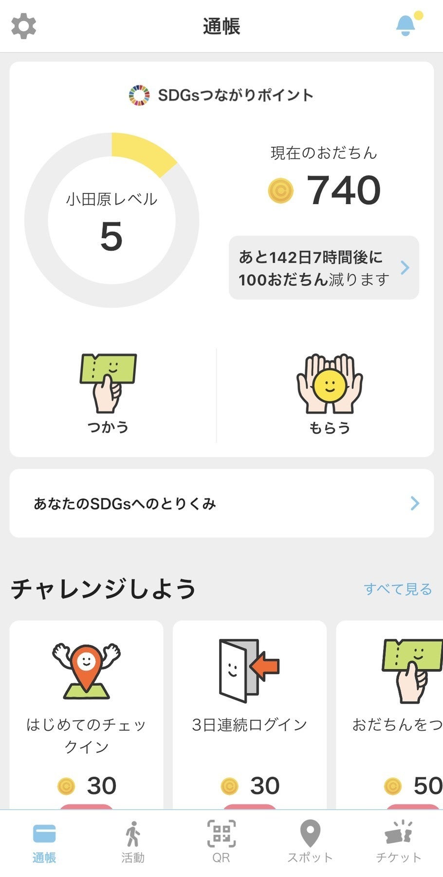 「まちのコイン」おだちんのアプリ内には自身のレベルや、レベルを上げるためのチャレンジ内容があってゲーム感覚で、楽しむことができます。