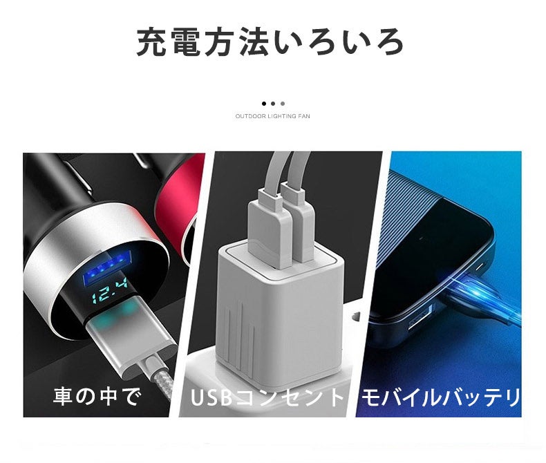 車の中や、コンセント、モバイルバッテリーなどで充電可能です。