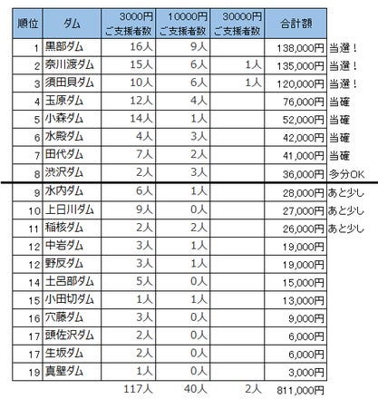 個別のダムでみますと、黒部ダム、奈川渡ダム、須田貝ダムが単独で10万円を超えるご支援を頂けていて、統一デザインのダムカード発行が決定しています。