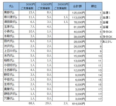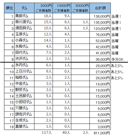 皆さま、これまでの多大なご支援、本当にありがとうございます。クラウドファンディング終了まで残り1週間を切ったところですが、昨日(9/19)時点の途中結果をご報告します。 非常に多くの方からの温かいお気持ちにより、総額で80万円を超えるご支援を頂き、8基以上での統一デザインのダムカード発行が決まっています。個別のダムでみますと、黒部ダム、奈川渡ダム、須田貝ダムが単独で10万円を超えるご支援を頂けていて、統一デザインのダムカード発行が決定しています。 また今回は、私達が野反ダム(現在12位)で水中ロボットを使用して点検しているようすを紹介します。 「貯水池に落っこちてしまわないよう、安全第一で頑張ってます!!!」 あらためまして、皆さまからのご支援に御礼申し上げます。ありがとうございました。また後日、途中結果をご報告致します。