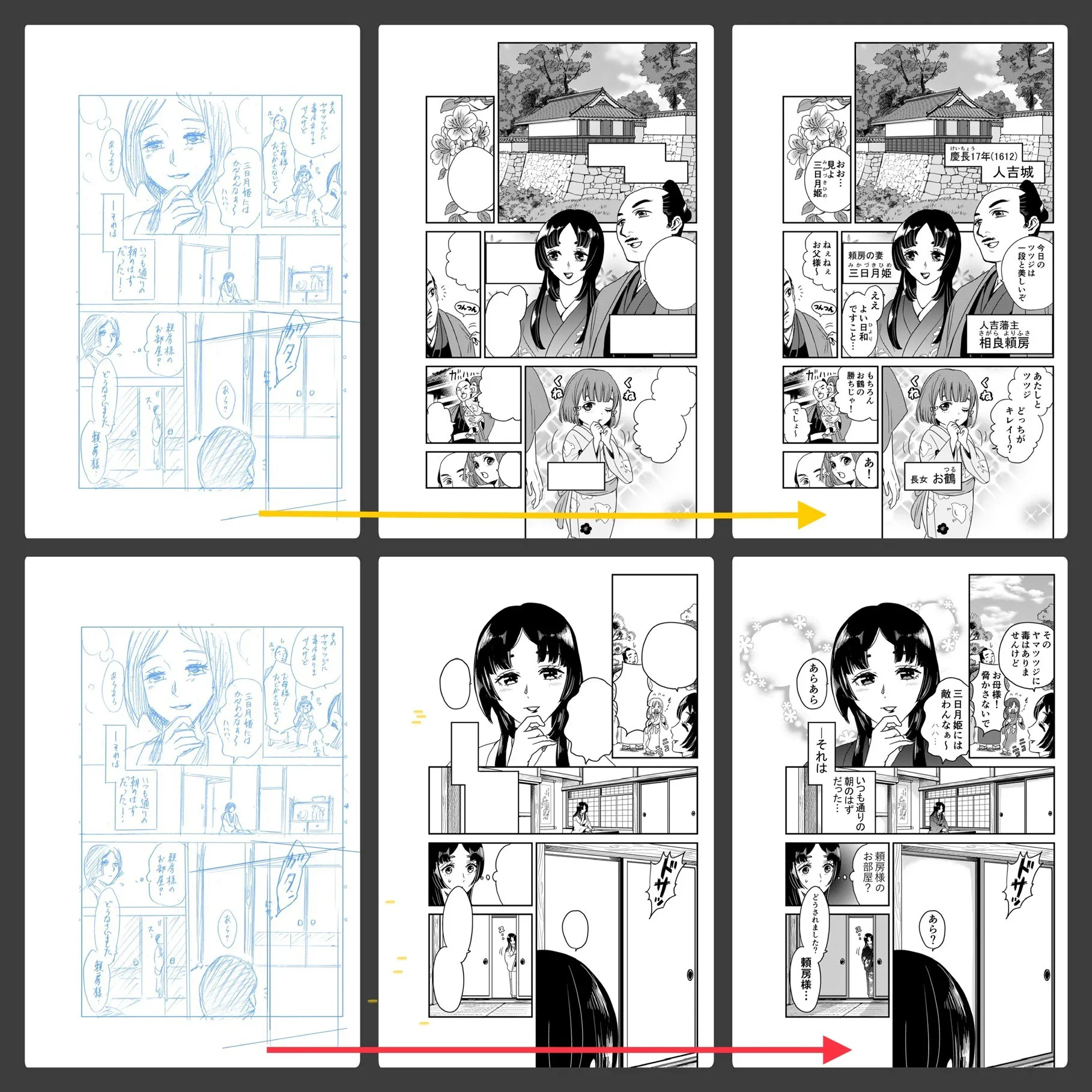 作画のほうは、原作(ネーム)から完成漫画へと、写真のようにプロセスが進んでいます。花林ソラさんが頑張ってくださっています。