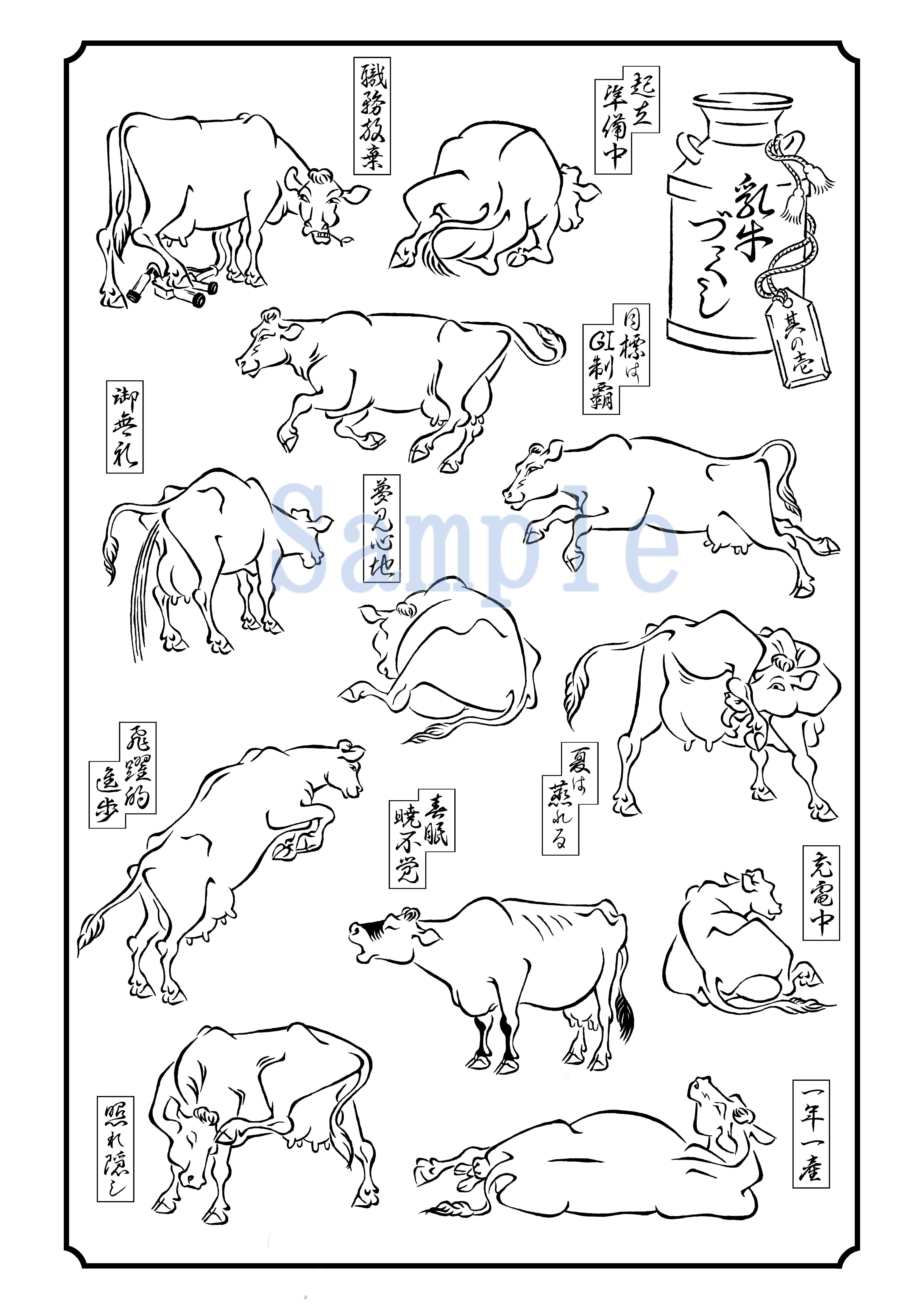 これはまだ下絵の段階ですが、全12頭の牛たちが、いろんな仕草をしています。