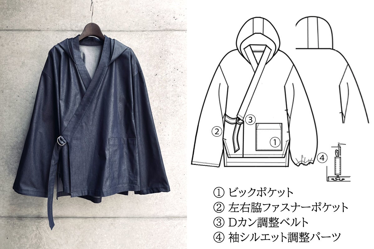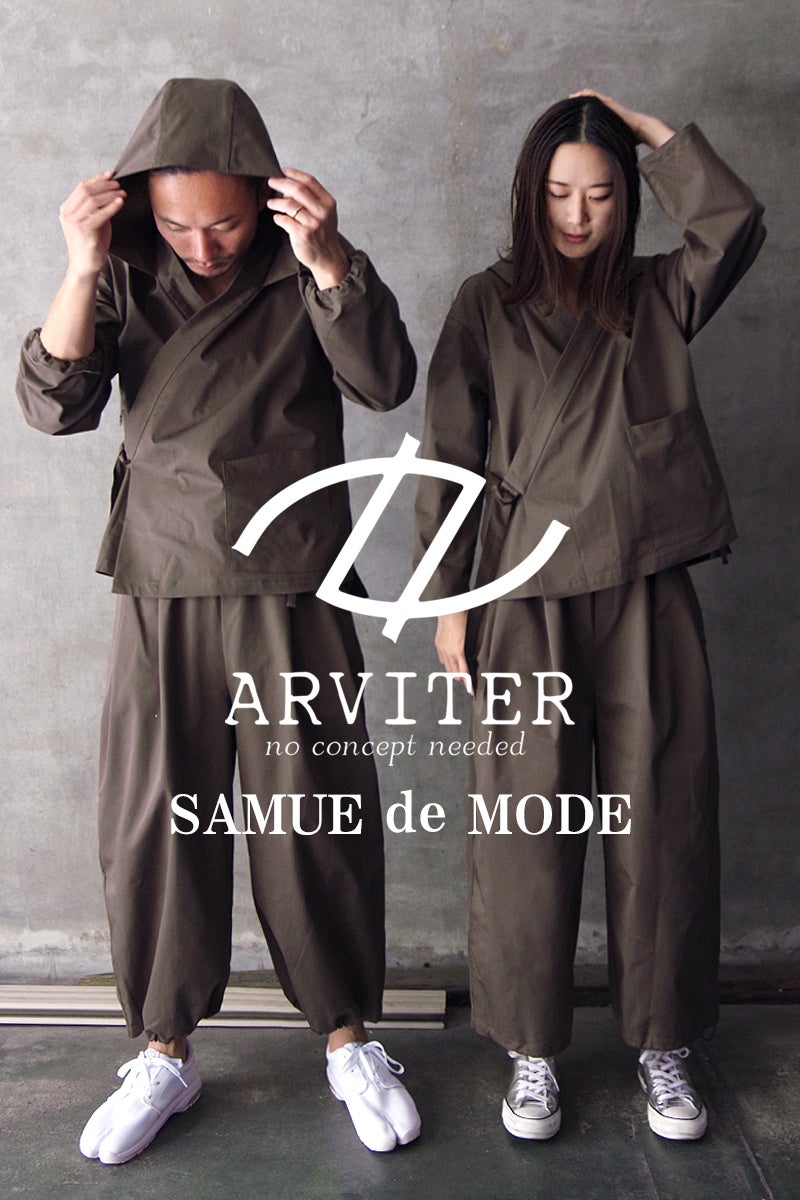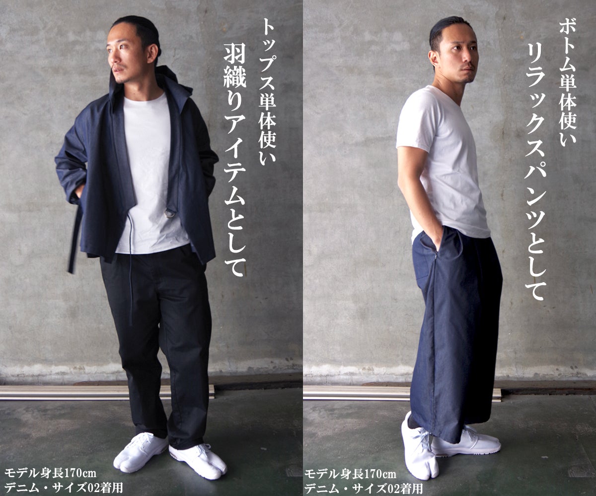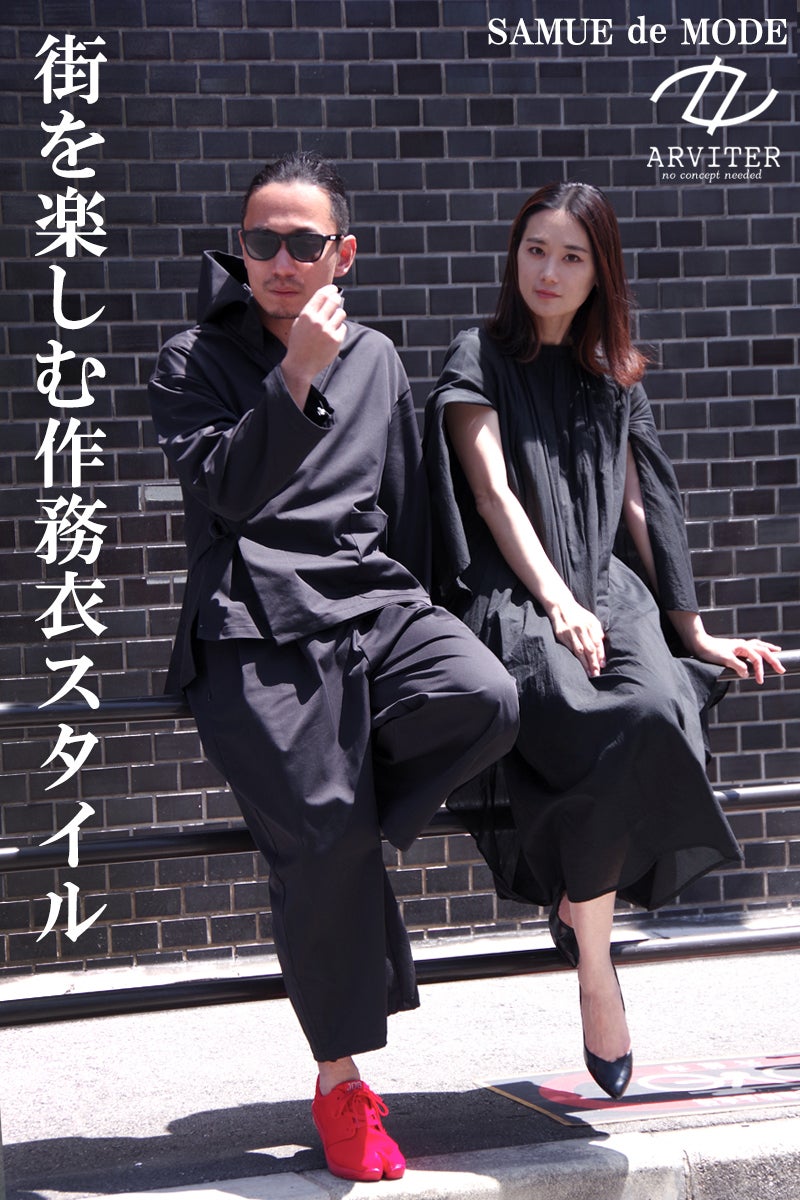 「街を楽しむ作務衣」をテーマに、作務衣の持つ基本的な構造は残しつつ、長年培った洋服作りの技術を注入する事で「モードなファッションウェア」に仕上げています。もちろん作務衣の長所は踏襲しているので締め付けがなく、シーンに合わせてフィット感をアレンジ出来ます。
