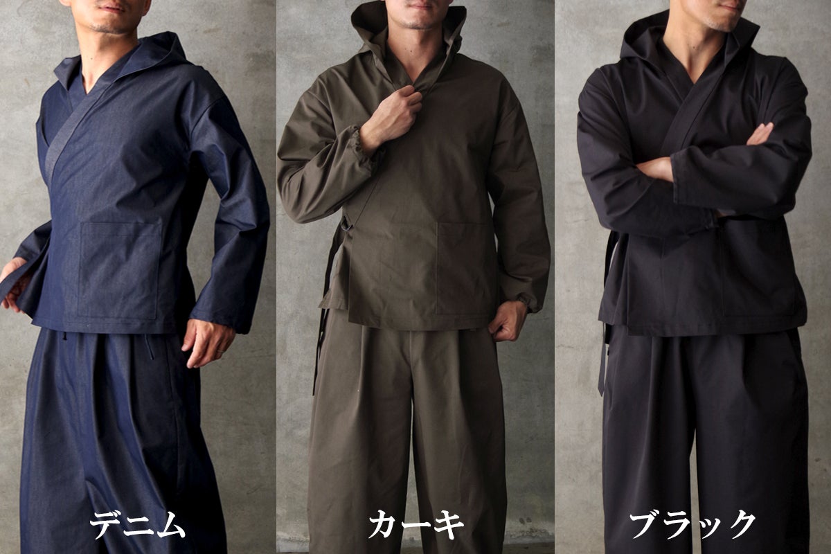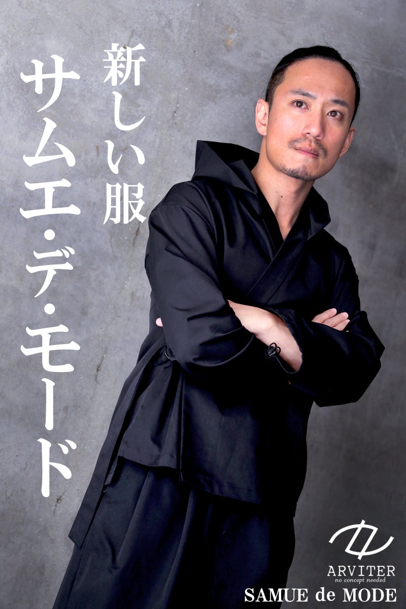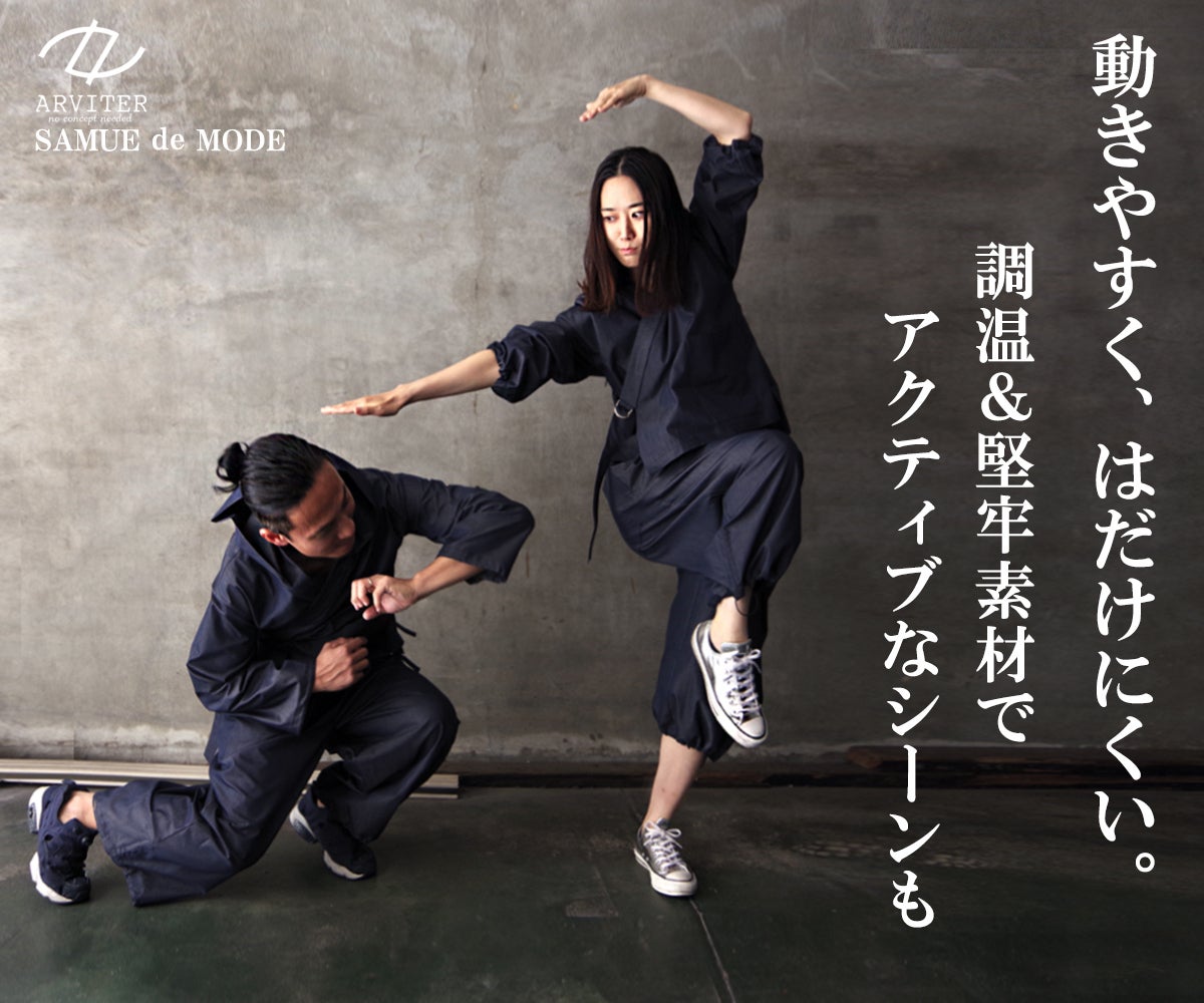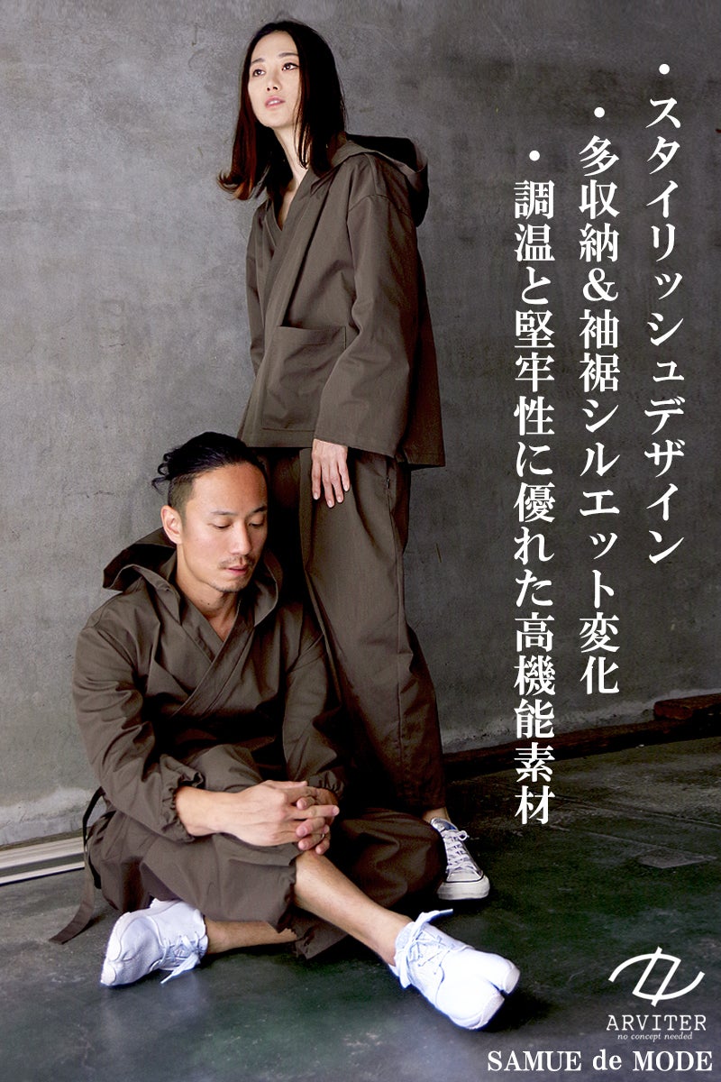 温泉や宿泊先で「浴衣」や「甚兵衛」を着た時に感じる、ゆったりとした着心地、和装ならではのしっくり感。あの優しい着用感をそのままに格好良く決まるウェアを作れないか。そこから開発が始まりました。検証を重ねる中で「作務衣」がベースアイテムとなり、完成したのが「サムエ・デ・モード」です。