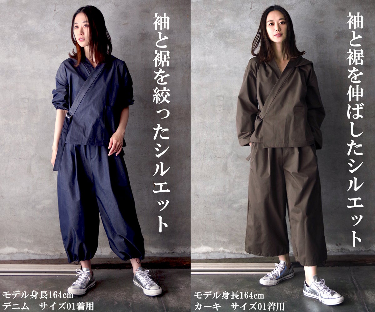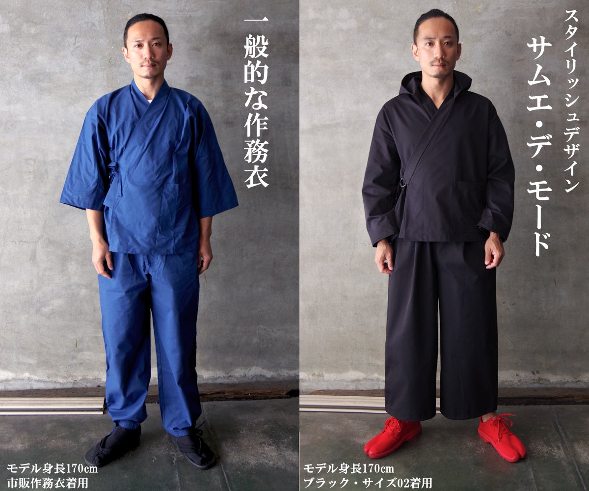 通常の作務衣とサムエ・デ・モードの最大の違い、それはスタイリッシュなシルエットデザインです。作務衣の持つ着心地の良さ、体型を拾わないリラックス性は残していますが、全体のバランスを一から再構築することで和洋ミックスの美しいシルエットに仕上げています。