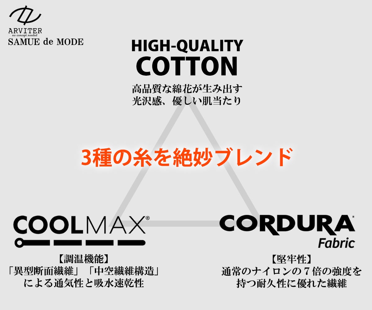 サム・エ・デモードは生地品質にも抜かりがありません。上質コットンと2種類の高機能素材をブレンドすることで快適な着心地を実現しています。