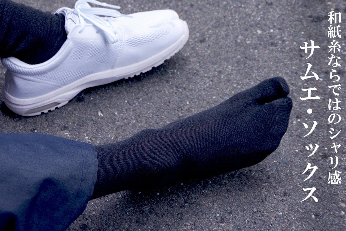 もリターン品としてご用意させて頂きました。和紙から出来た糸「和紙糸」をミックスすることで驚きの爽快感を実現しています。和紙糸はとても丈夫な素材なので、普通の靴下と同じ様に洗濯機で洗うことが可能。蒸れず臭わず(速乾消臭性)を持つ独特のシャリ感はヤミツキになる履き心地です。