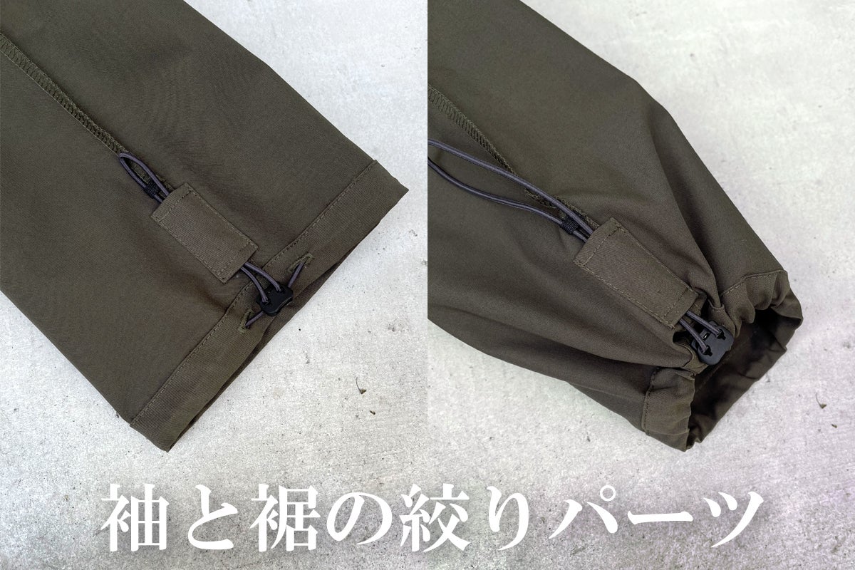 全体のバランスだけではなく、襟に立体的に配した大きめフード、ウエストのDカンベルト、袖裾のシルエット変化機能など細部までこだわって設計しています。