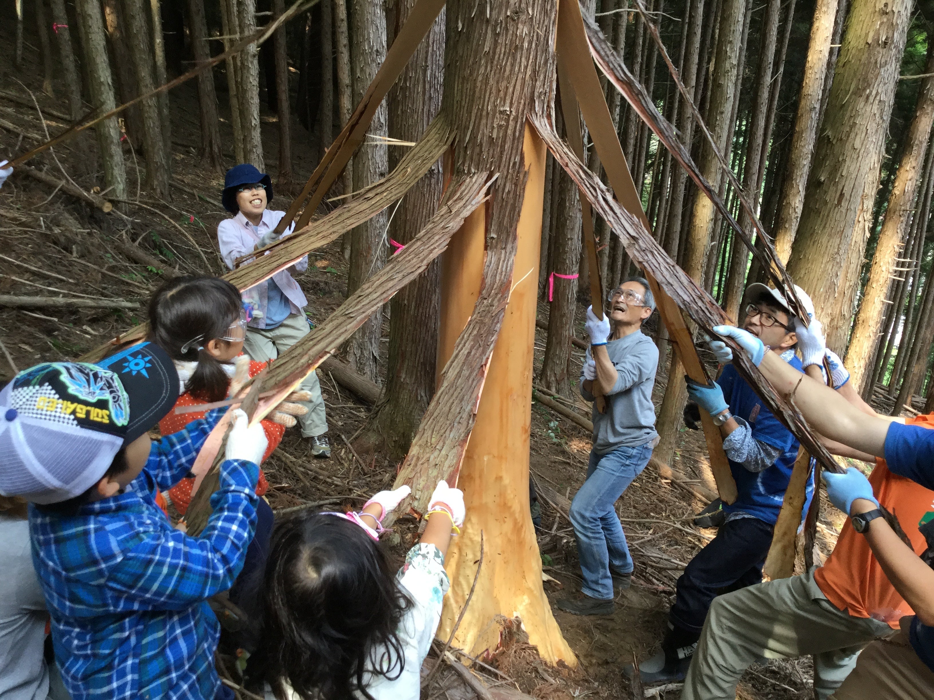 チェーンソーを使わず間伐効果を出せるので、女性でも子どもでも参加できる国民全員参加の画期的な間伐手法です。国民全員参加で植林した森の手入れは、林業のプロだけでは間に合わず、国民全員で間伐しなければならないくらいの面積が日本中に広がっています。