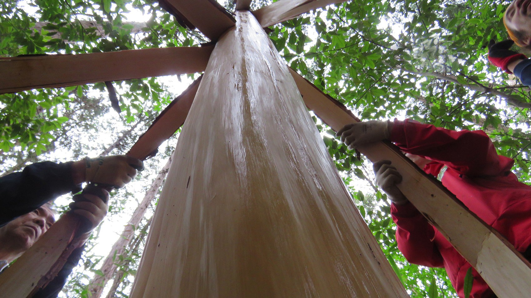 スギ・ヒノキの皮を剥き、立ったまま森で天然乾燥をかけます。木はいのちを絶たれ、少しずつ落ちる葉の間から空が見え始めます。林床に光が届き、そこにあったタネが芽を出します。真っ茶色だった林床に植物が戻ってくるのです。そうすると、そこにたくさんのいのちが集まったり、森の保水力が戻り「緑のダム」としての機能も果たす森になっていきます。
