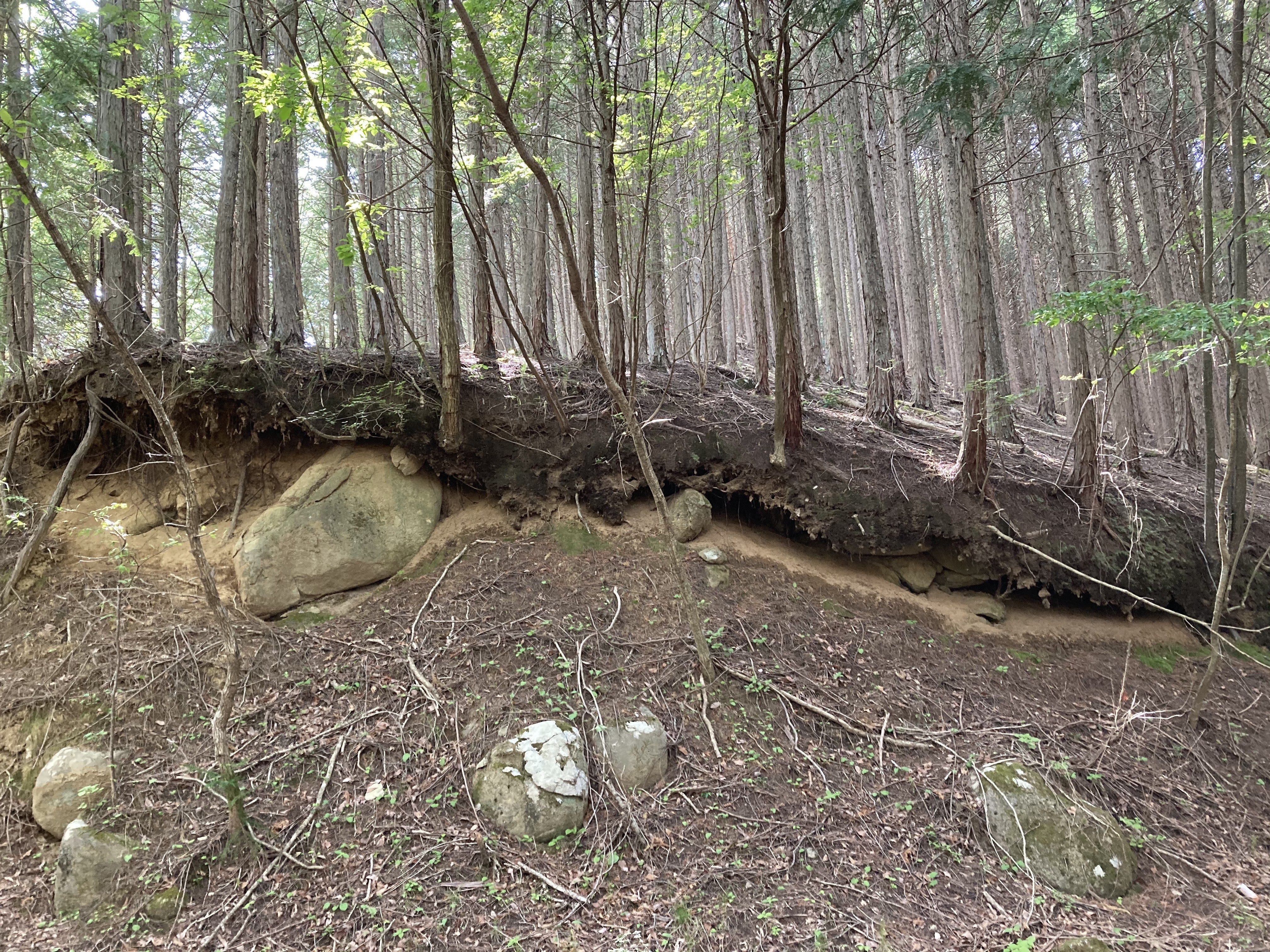 下の写真は、大雨が降れば板状に絡み合った根っこが表層崩壊する危険があります。