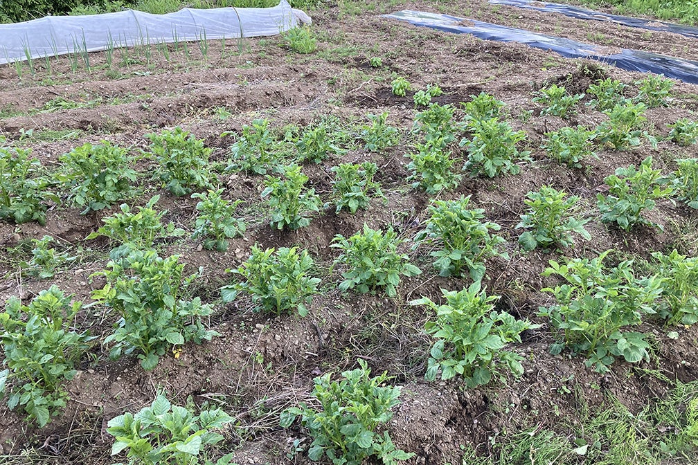 写真は、裏のおばあちゃんがくれたじゃがいものタネを植えた畑です。トマトの苗もここで育てています。「いままで農業なんてやったことないずら?よくやるじゃん。」と毎回褒めてくれます。