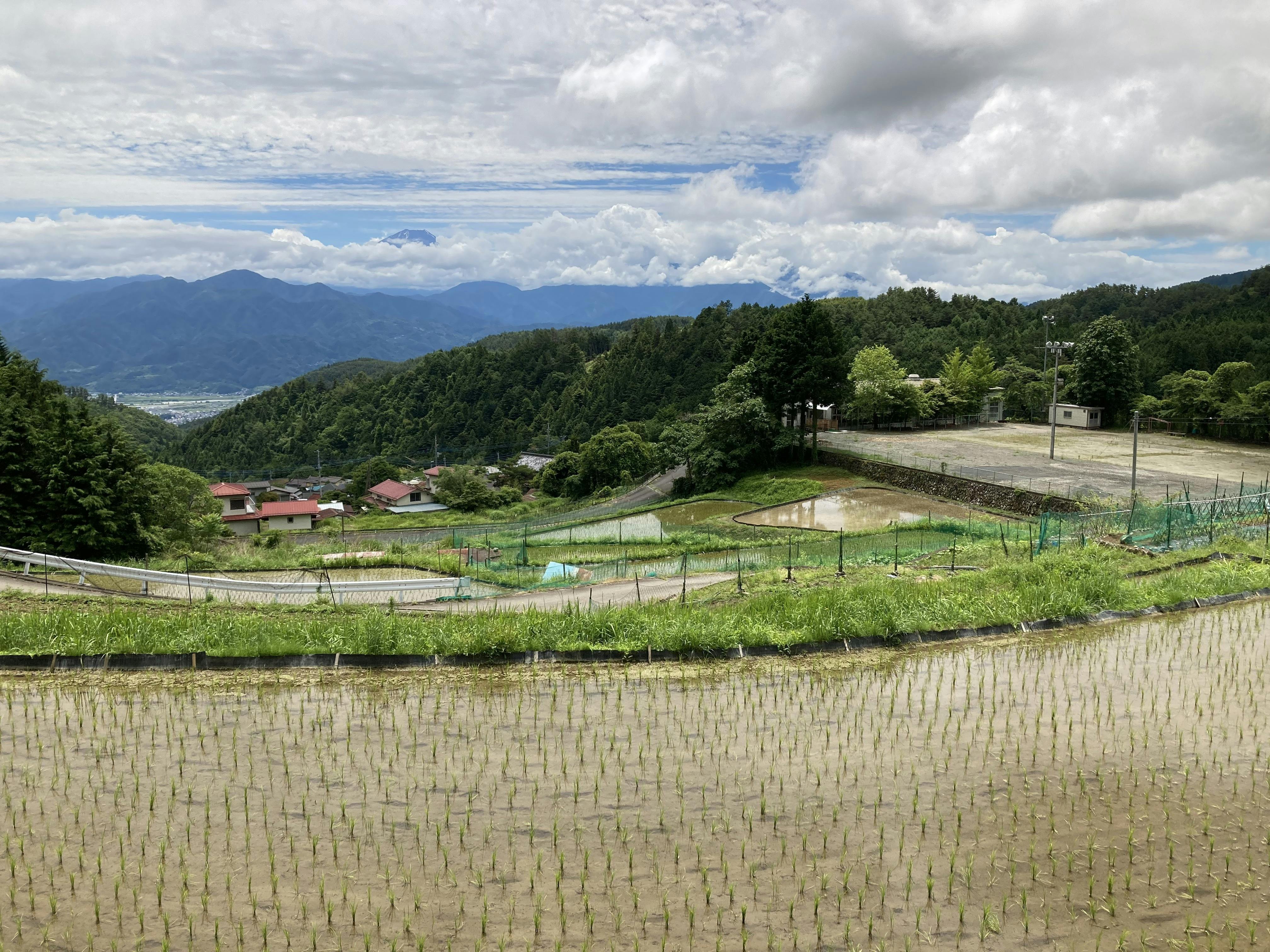 雨の合間に顔を見せてくれた富士山と美しい棚田の風景です。田植えから一週間して手直しを終えたわたしたちの田んぼは、小学校跡地のグラウンドのすぐ裏を借りています。