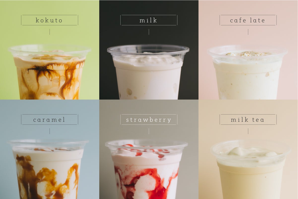 初回の販売となる今回は、バニラミルク・いちご・コーヒー・ミルクティー・黒糖・キャラメルの6種類のフレーバーを販売。フレーバーは、季節感のあるものや、地域の食材をつかったものを続々追加予定です。