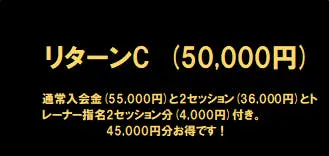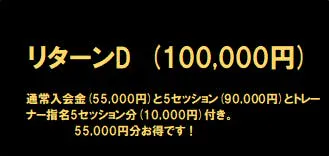 なんと、通常入会より55,000円分もお得です!通常入会金(55,000円)と5セッション(90,000円)とトレーナー指名5セッション分(10,000円)付き。定期的に通って頂く方にお勧めです!