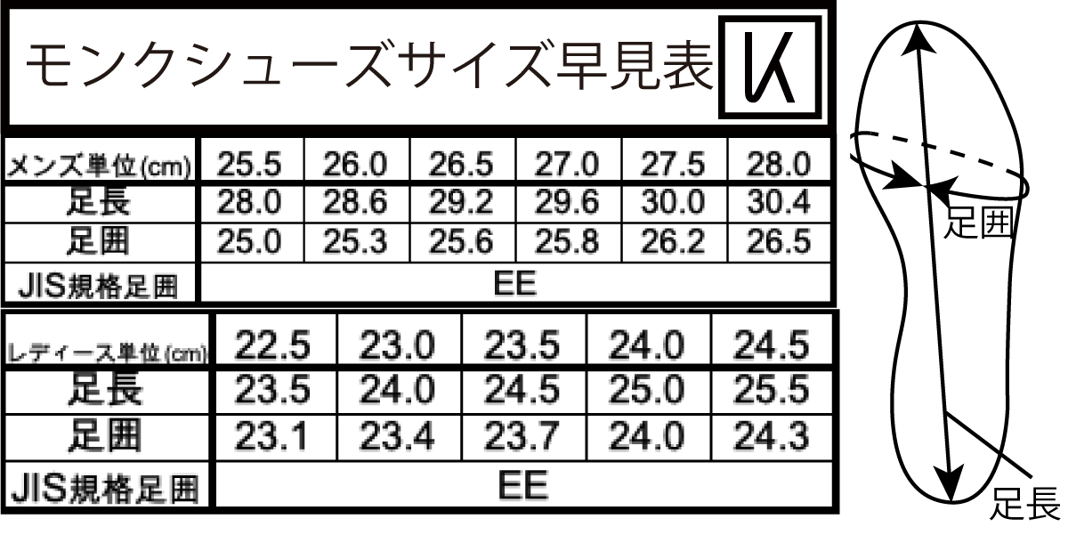 S:22.5〜23.0、M:24.0〜24.5、L:25.5〜26.0、M:27.0〜27.5