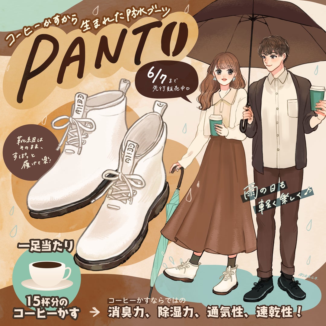 「Panto全天候型防水コーヒーブーツ」はSNSで人気イラストレーターのmeeco様にご紹介頂きました!話題のシミラールックコーデで梅雨の憂鬱な気分を晴れやかにしましょう!