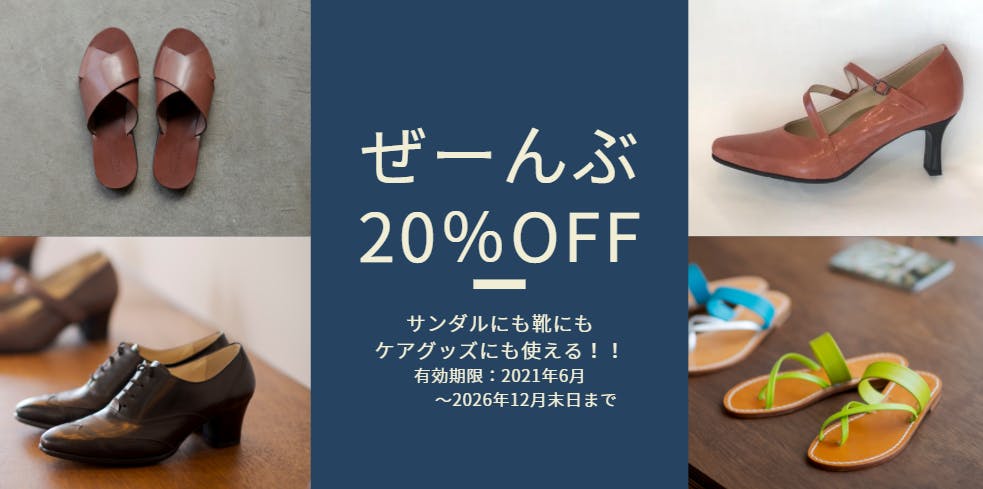 シュービーのお靴やKALAFISAサンダル、シューケアグッズなど(修理、靴磨きをのぞく)が、ず~っと20%OFFになります。10足以上お買い上げの方は、かなりお得なチケットです。