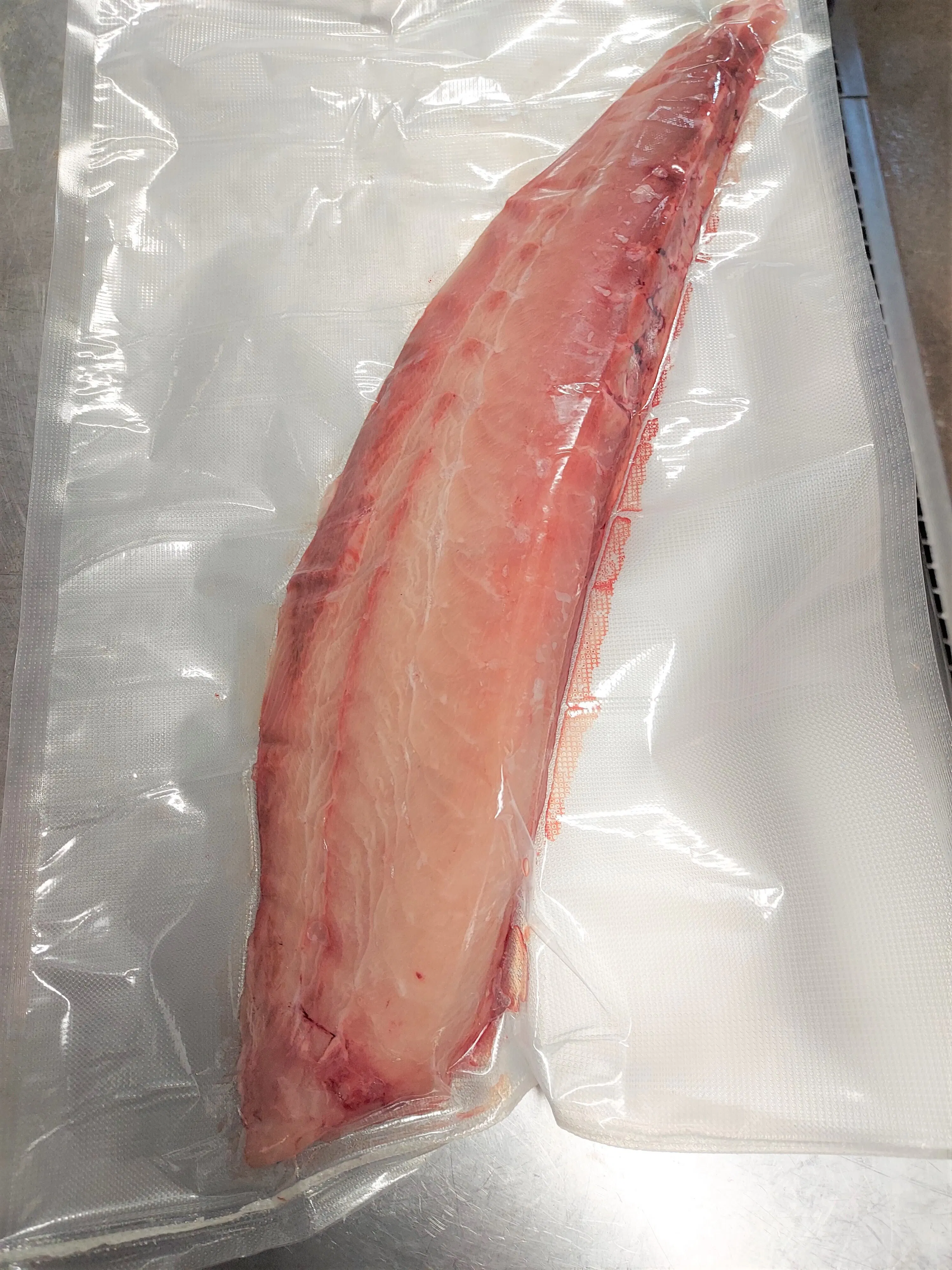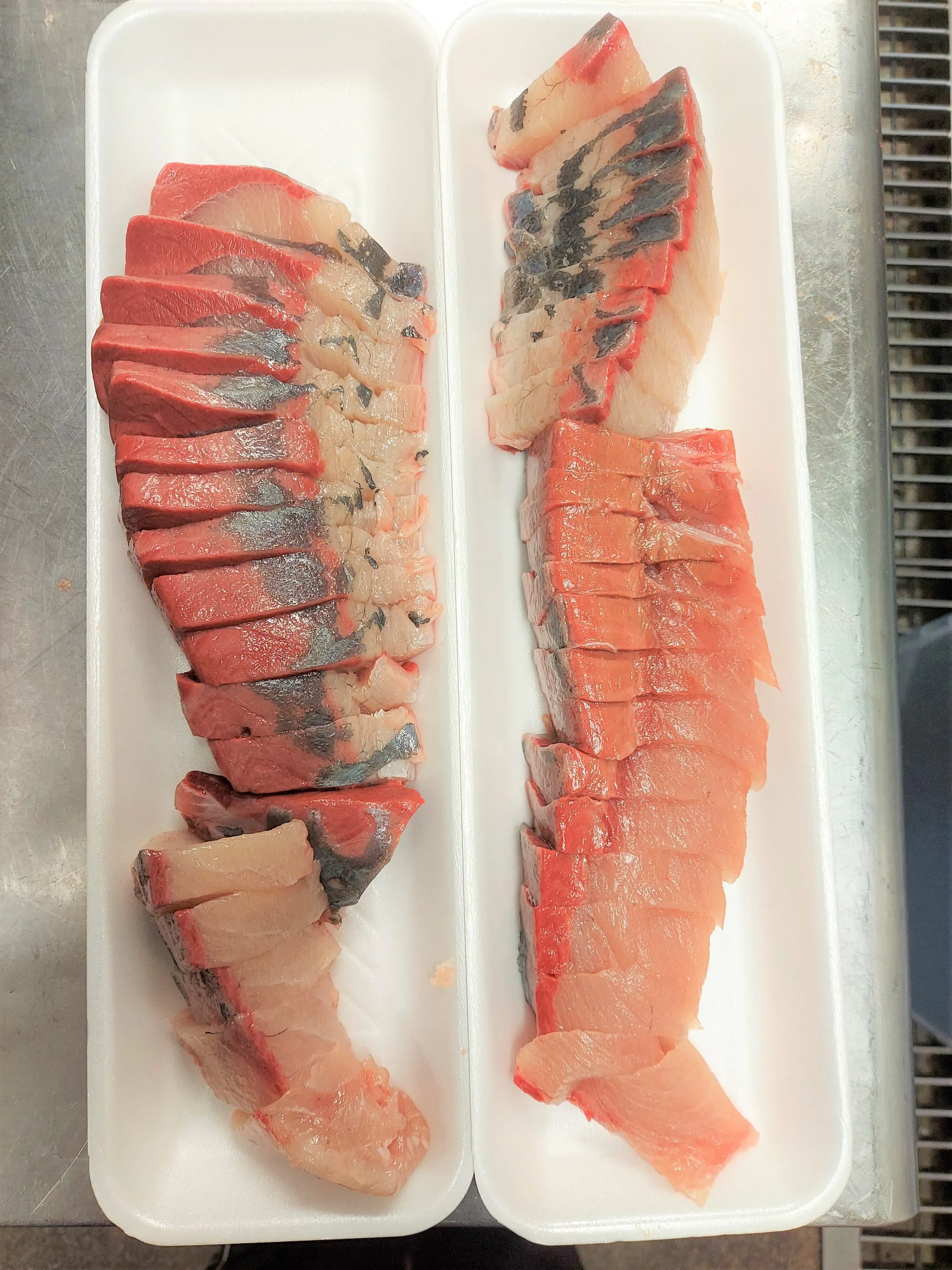 天然は身が赤黒く味はすこし癖があります。当然天然ですので寄生虫なども多いです。