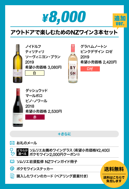 ・「アウトドアで楽しむためのNZワイン3本セット」と「ソムリエと選ぶNZワインセット」完売につき、新たにそれぞれに「追加ver.」を設けました。